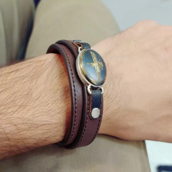 Price and Buy Men’s Leather Bracelet with Original and Natural Hadid Farvahar Gemstone, Silver Surrounding Frame