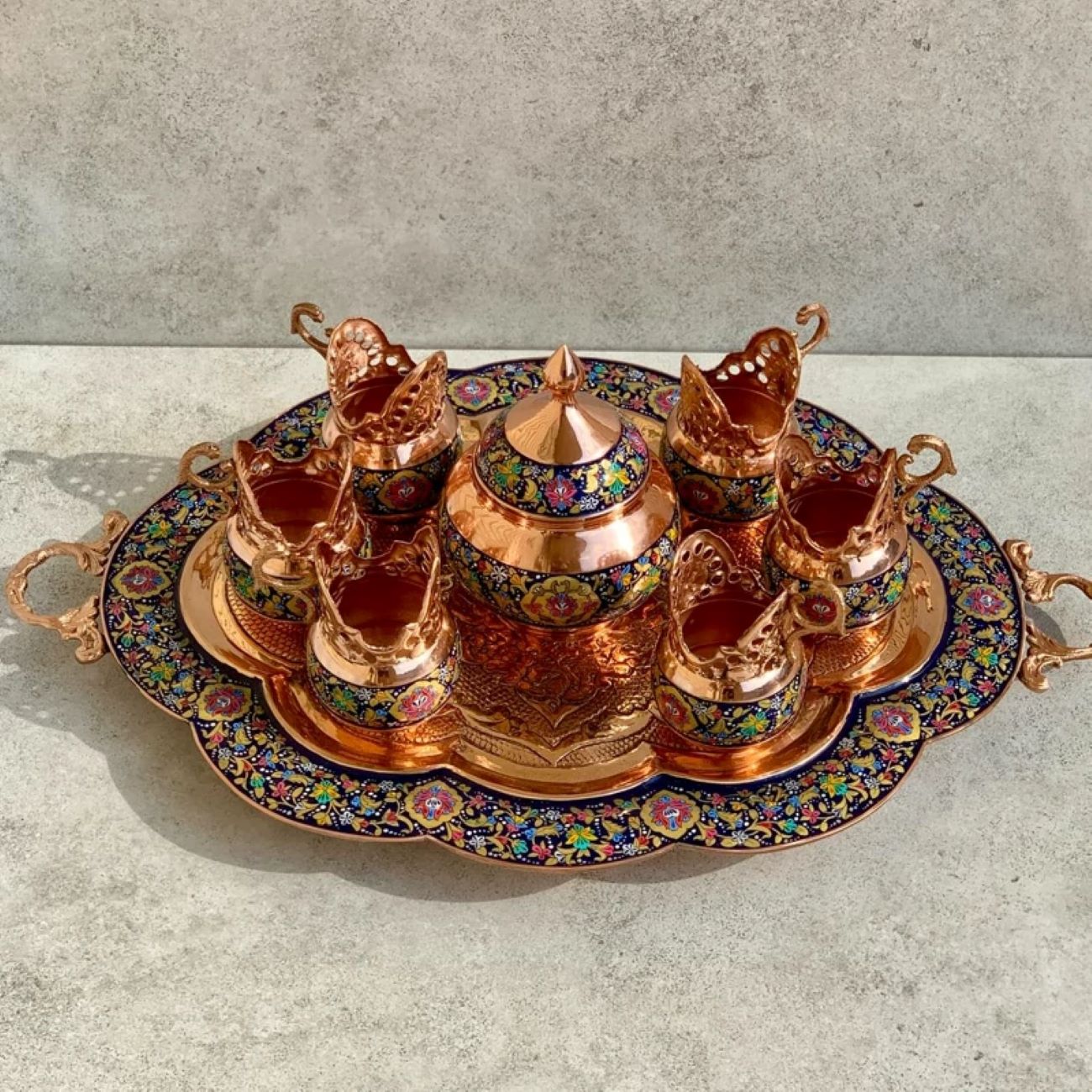 Experience the elegance of our Handcrafted Persian Copper Tea & Coffee Set – Engraved, meticulously crafted to enhance your tea and coffee rituals. Each piece showcases intricate engravings that reflect Persian artistry and cultural heritage, making it a perfect blend of beauty and functionality. Ideal for serving a variety of teas and coffees, this set adds a touch of artisanal charm to any dining experience, whether for daily use or special occasions. Embrace the craftsmanship and timeless allure of Persian design with this exquisite copper set.