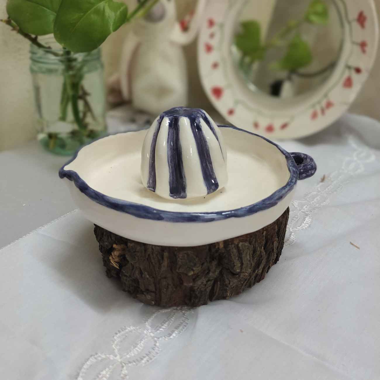 Elevate your kitchen counter with this beautifully crafted ceramic citrus juicer, designed in a clean white and deep navy blue palette. Its hand-glazed finish and subtle boho style make it both a functional tool and a decorative piece, perfect for those who appreciate artisanal charm in everyday items. Built for small-batch juicing, it features a sturdy reamer that efficiently extracts juice from lemons, limes, and small oranges. The ergonomic shape makes it easy to grip and press, while the ceramic material is naturally resistant to citrus acid and easy to clean after use. Whether you’re starting your morning with fresh lemon water or garnishing a cocktail, this piece blends seamlessly into rustic, coastal, or minimalist kitchens. It’s a simple, elegant way to bring handcrafted beauty to your daily routine..