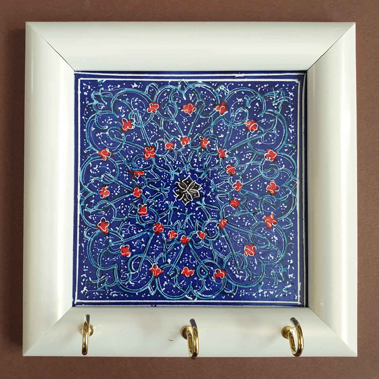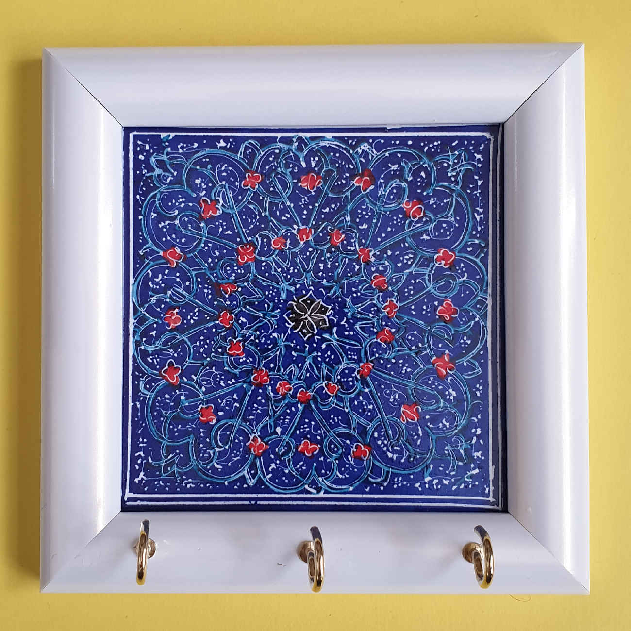 Add a touch of elegance to your entryway with this beautifully handcrafted wall key holder. Designed to blend functionality with art, it features a sturdy wooden frame that complements its intricate Persian tile-inspired design. Each piece is thoughtfully made by skilled artisans, ensuring a unique and high-quality finish. The vibrant ceramic tiles display timeless patterns, bringing cultural charm into your home decor. Fitted with multiple hooks, it offers a practical solution for keeping your keys organized and easily accessible. Its compact size makes it perfect for hallways, kitchens, or office walls. This piece not only helps declutter your space but also serves as a decorative accent. The combination of warm wood and colorful ceramics adds a cozy yet sophisticated vibe. Easy to mount and built to last, it’s both a functional and artistic addition to your space. Ideal as a thoughtful gift or a special treat for yourself.