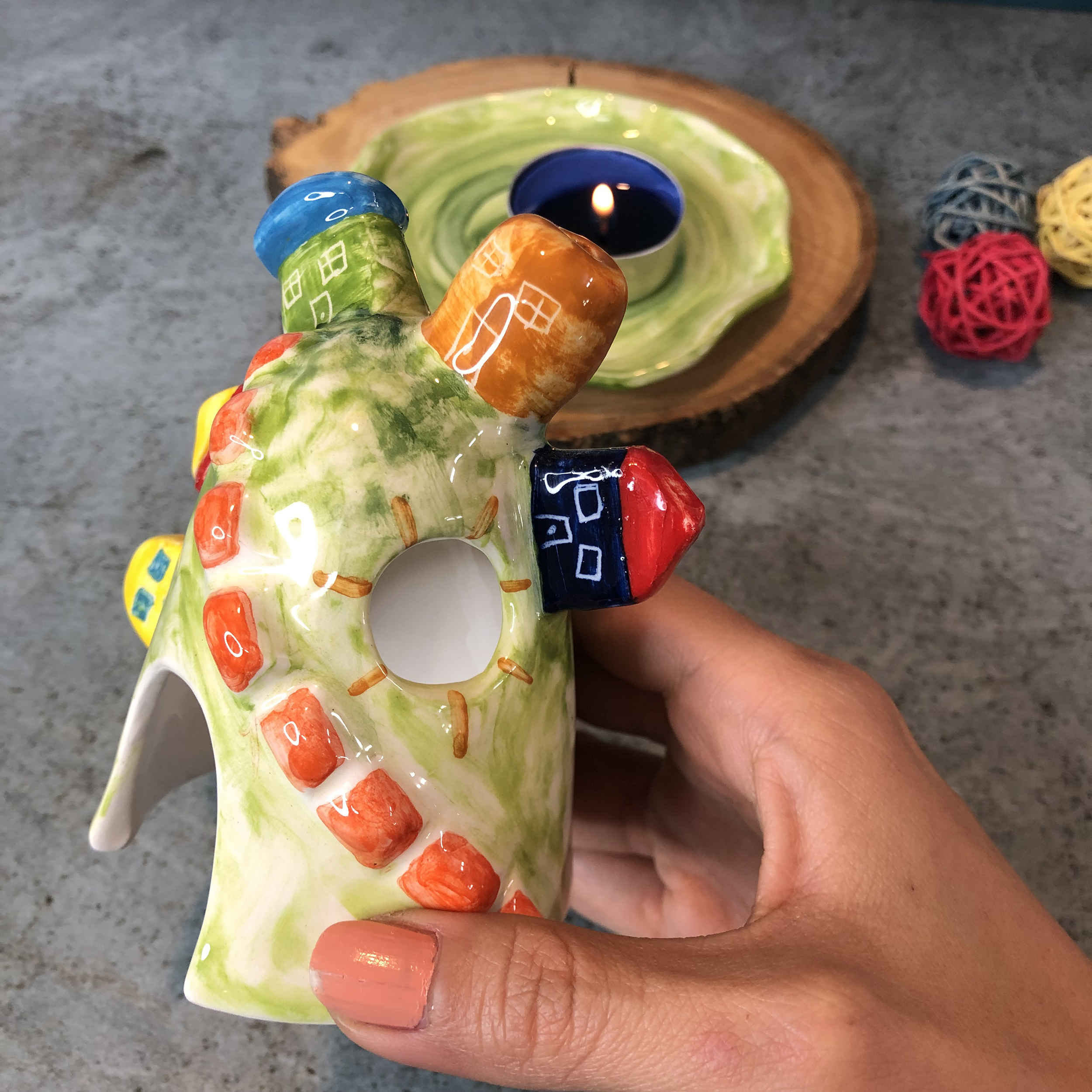 The Ceramic Candle Holder with Colorful Houses Design is a charming addition to any home décor. Handcrafted with care, it features a delightful motif of colorful houses that evoke a sense of quaint village life. This decorative piece not only serves as a functional candle holder but also doubles as a work of art. The intricate detailing on each house, from the tiny windows to the rooftops, adds a whimsical touch to its design. Whether placed on a dining table, mantle, or as a centerpiece, this ceramic candle holder effortlessly enhances the ambiance with its unique blend of craftsmanship and aesthetic appeal. Perfect for adding a touch of warmth and character to your living space, it invites admiration and creates a cozy environment ideal for relaxation and gatherings.