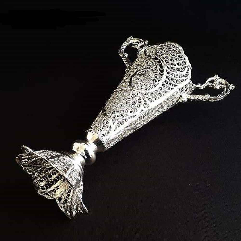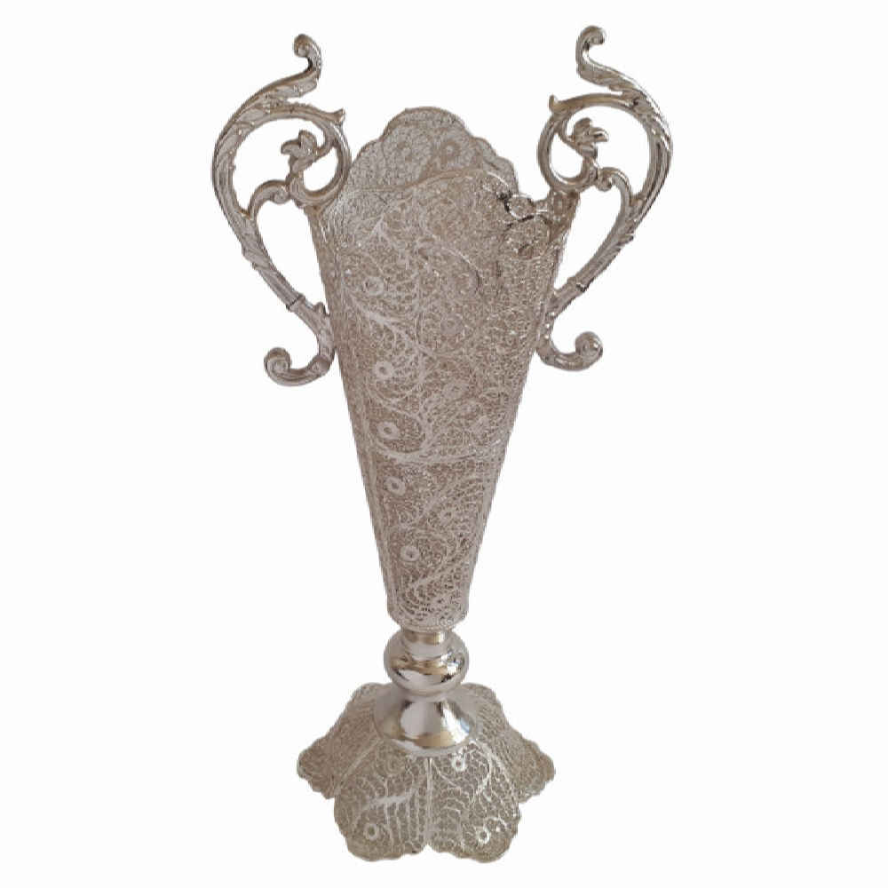 Embark on an artistic journey with our Handcrafted Persian Filigree Decorative Vase, meticulously fashioned with copper and adorned with a glistening silver coating. Each vase within this collection is a testament to Persian artistry, meticulously designed with traditional elements and delicate floral patterns by skilled Iranian artists. The exquisite fusion of copper and silver, coupled with the intricate filigree work, reflects an unparalleled blend of cultural richness and timeless beauty. Crafted with precision and care, these artisanal vases capture the essence of Persian elegance through the intricate filigree artistry. Iranian artisans’ meticulous etching of elaborate floral patterns on copper with a silver coating exudes refined tradition and artistic finesse. Each vase embodies radiant cultural heritage, infusing spaces with elegance and sophistication, harmonizing tradition and art seamlessly.