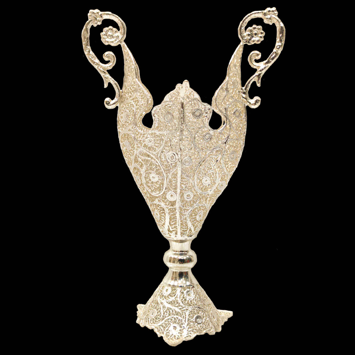 Embark on an artistic journey with our Handcrafted Persian Filigree Decorative Vase Set, meticulously fashioned with copper and adorned with a glistening silver coating. Each vase within this collection is a testament to Persian artistry, meticulously designed with traditional elements and delicate floral patterns by skilled Iranian artists. The exquisite fusion of copper and silver, coupled with the intricate filigree work, reflects an unparalleled blend of cultural richness and timeless beauty. Crafted with precision and care, these artisanal vases capture the essence of Persian elegance through the intricate filigree artistry. Iranian artisans’ meticulous etching of elaborate floral patterns on copper with a silver coating exudes refined tradition and artistic finesse. Each vase embodies radiant cultural heritage, infusing spaces with elegance and sophistication, harmonizing tradition and art seamlessly.