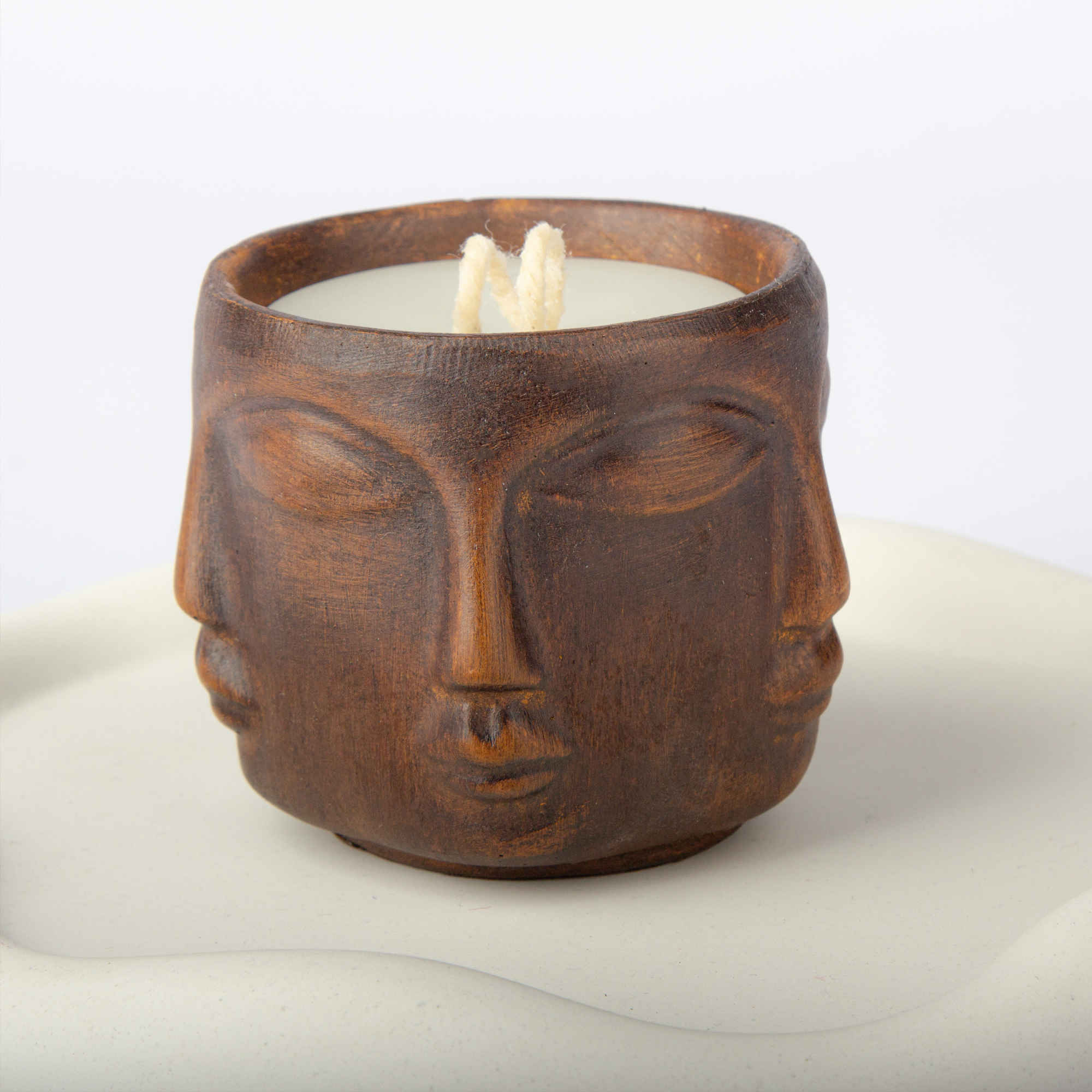 Add warmth and charm to any space with this beautifully crafted wooden jar candle. Made from natural wood, each jar is unique, featuring rich grains and rustic textures that enhance its earthy appeal. The candle inside is made from a premium wax blend, designed to burn evenly and provide a long-lasting glow, perfect for cozy evenings or relaxed gatherings. What truly sets this piece apart is the artistic face design carved into the wooden exterior. It brings a subtle yet striking personality to the candle, blending traditional craftsmanship with modern artistic flair. Whether displayed on a shelf, side table, or as part of a centerpiece, it becomes an instant conversation starter. Beyond its aesthetic, the candle offers a gentle, inviting fragrance that complements its rustic look. Ideal for gifting or personal indulgence, it brings together style, scent, and sustainability in one elegant form. Whether lit or simply admired, it adds a soulful touch to your home décor.