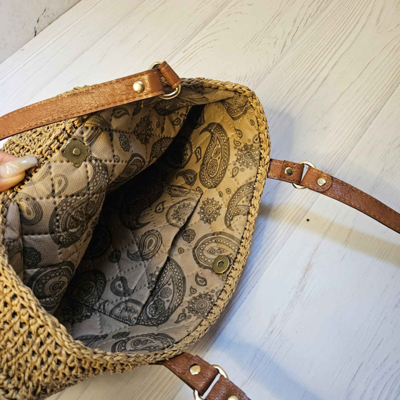 Elevate your summer style with the Handwoven Raffia Bag – a perfect blend of trendiness and functionality. Crafted from high-quality Turkish raffia, this double-sided tote offers versatility: one side features a smooth, understated pattern, while the other boasts a beautifully textured design, allowing you to switch looks depending on your mood or outfit. Inside, a durable three-layer lining with elegant patterns not only enhances the bag’s aesthetic but also ensures long-lasting strength and reliability. A secure magnetic closure and an internal pocket keep your essentials organized, making this tote as practical as it is stylish. The dark honey-toned faux leather adjustable straps complement the natural raffia body, adding a touch of classic sophistication. Lightweight yet sturdy, this handmade bag is ideal for everyday use, beach outings, or travel. With its unique design and meticulous craftsmanship, this Raffia Bag is a must-have accessory for anyone seeking a chic, functional, and fashion-forward tote.
