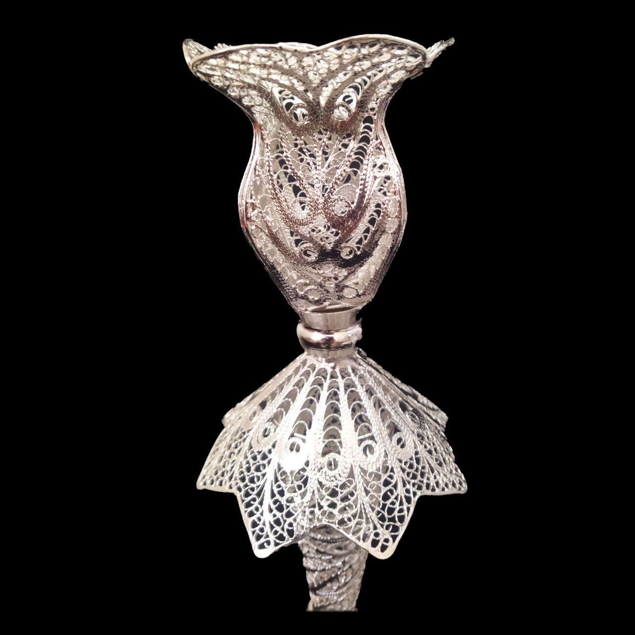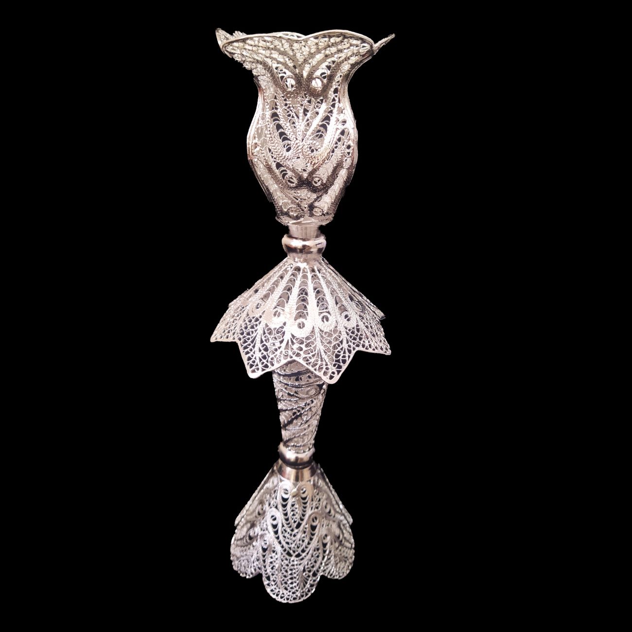 Elevate your ambiance with our exquisite Filigree Candlestick, a dazzling embodiment of Persian Elegance and artistic refinement. Crafted with precision, this candle holder features intricate filigree work meticulously applied to copper and coated with a layer of luxurious silver. The result is a masterpiece that seamlessly marries traditional Persian design with contemporary aesthetics. The delicate filigree patterns dance across the surface, casting enchanting shadows when illuminated, creating a captivating interplay of light. Beyond its functional use, this candlestick is a work of art, showcasing the skilled craftsmanship and cultural richness inherent in Persian design. Each piece tells a story of tradition and sophistication, making it a statement piece that adds a touch of opulence and artistic value to any space.