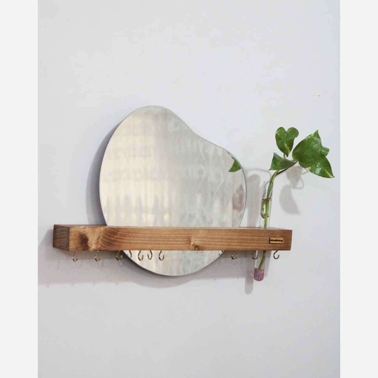 This key hanger showcases a sleek geometric design crafted from natural wood, blending modern aesthetics with practical function. The uniquely shaped mirror adds an artistic flair, creating a striking focal point for any entryway or hallway.Equipped with durable hooks, it provides ample space to neatly organize keys, accessories, and small essentials. Its compact design helps keep your space clutter-free while enhancing your home décor with contemporary style. Perfect for modern and minimalist interiors, this wall-mounted organizer combines clean lines with natural materials. It’s easy to install and offers a chic, functional addition to your everyday routine.