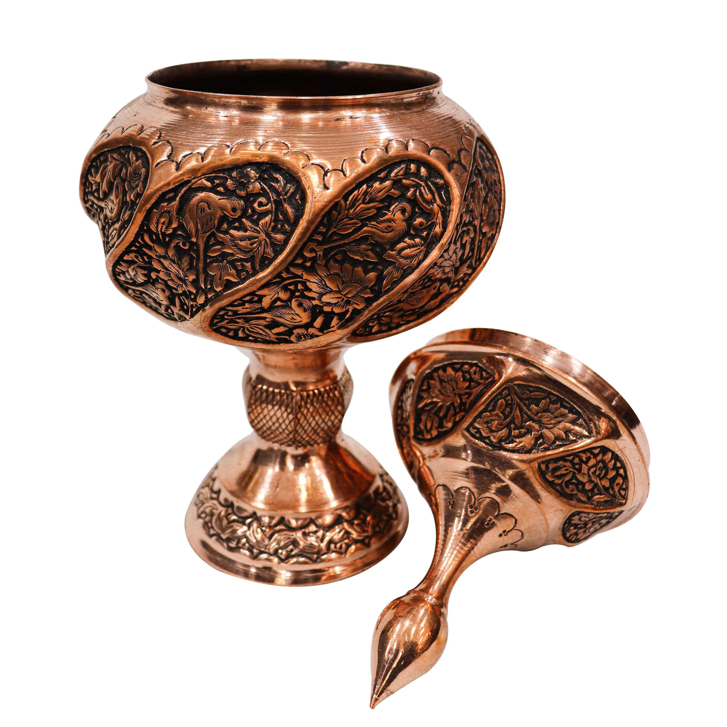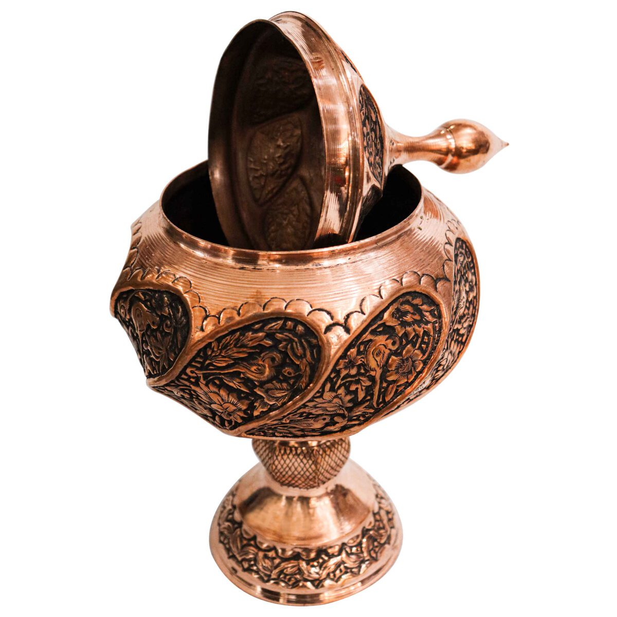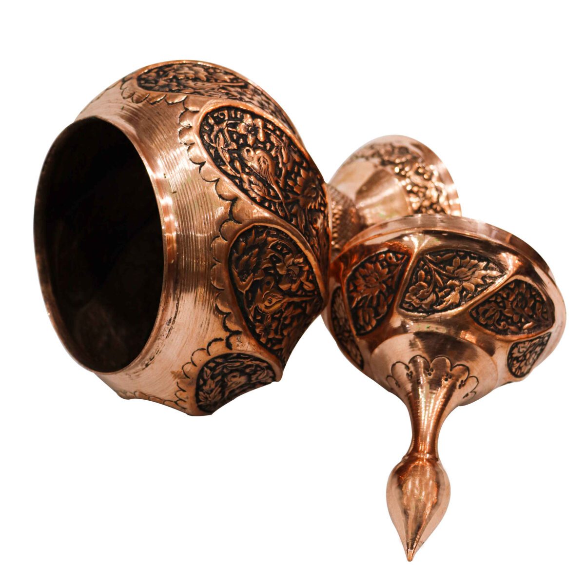 The Persian Copper Sugar Bowl Engraving Handcrafted with Floral Design is an exquisite piece that seamlessly marries elegance with tradition. Handcrafted by skilled artisans, this sugar bowl showcases the timeless art of Persian metalwork, with intricate floral engravings that wrap around its surface, each detail meticulously etched to perfection. Made from high-quality copper, the bowl exudes a warm, lustrous glow that not only enhances its aesthetic appeal but also speaks to its durability and lasting value. The floral engravings are a testament to the rich cultural heritage of Persian craftsmanship, each pattern telling a story of artistry and tradition passed down through generations. The bowl’s design is both functional and decorative, making it a versatile addition to any home. Use it to store sugar, spices, or small treats, and it will transform your kitchen or dining table into a space of refined elegance.