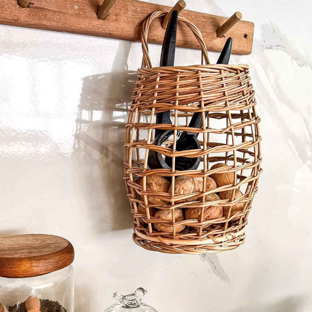 Elevate your home organization and decor with our exquisite Handwoven Wicker Basket. Crafted with precision and care, this versatile basket offers a myriad of practical uses. From storing potatoes and onions to organizing walnuts and kitchen tools, its functionality is unmatched. Not just practical, but also aesthetically pleasing, this basket doubles as a decorative pot holder, infusing your space with rustic charm. Its sturdy construction ensures durability, while its lightweight design makes it easy to hang and reposition as needed. Each basket undergoes meticulous craftsmanship, ensuring top-notch quality and longevity. Experience the timeless allure of handwoven artistry with our Wicker Basket, a perfect blend of style and utility for your home.
