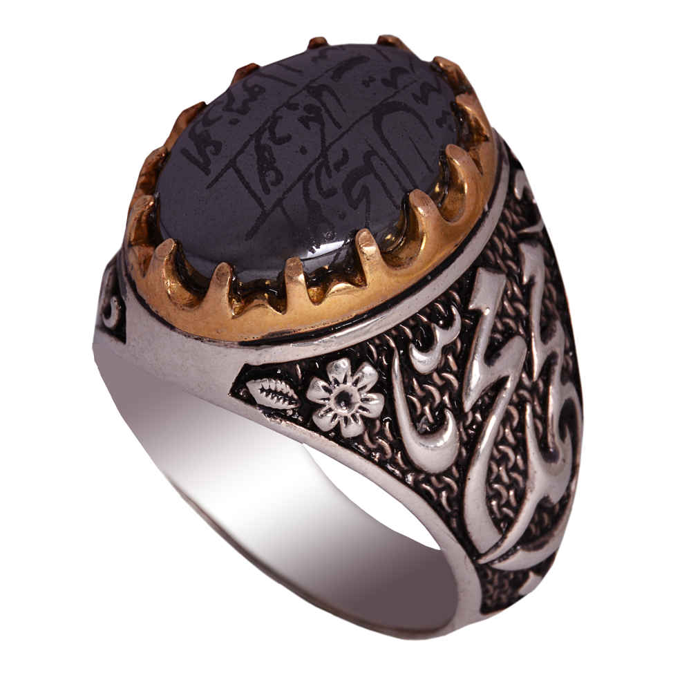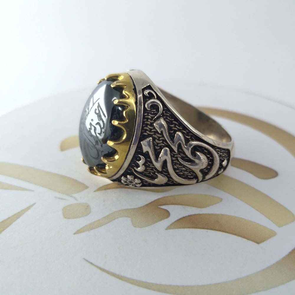 Condition New Product Type Hematite Ring Pattern Islamic Calligraphy Gemstone Type Natural Origin Iran Design Islamic Size Multi-Size Suitable for Shia Muslims Color Gray Gender Male Age Group Adult Material Silver