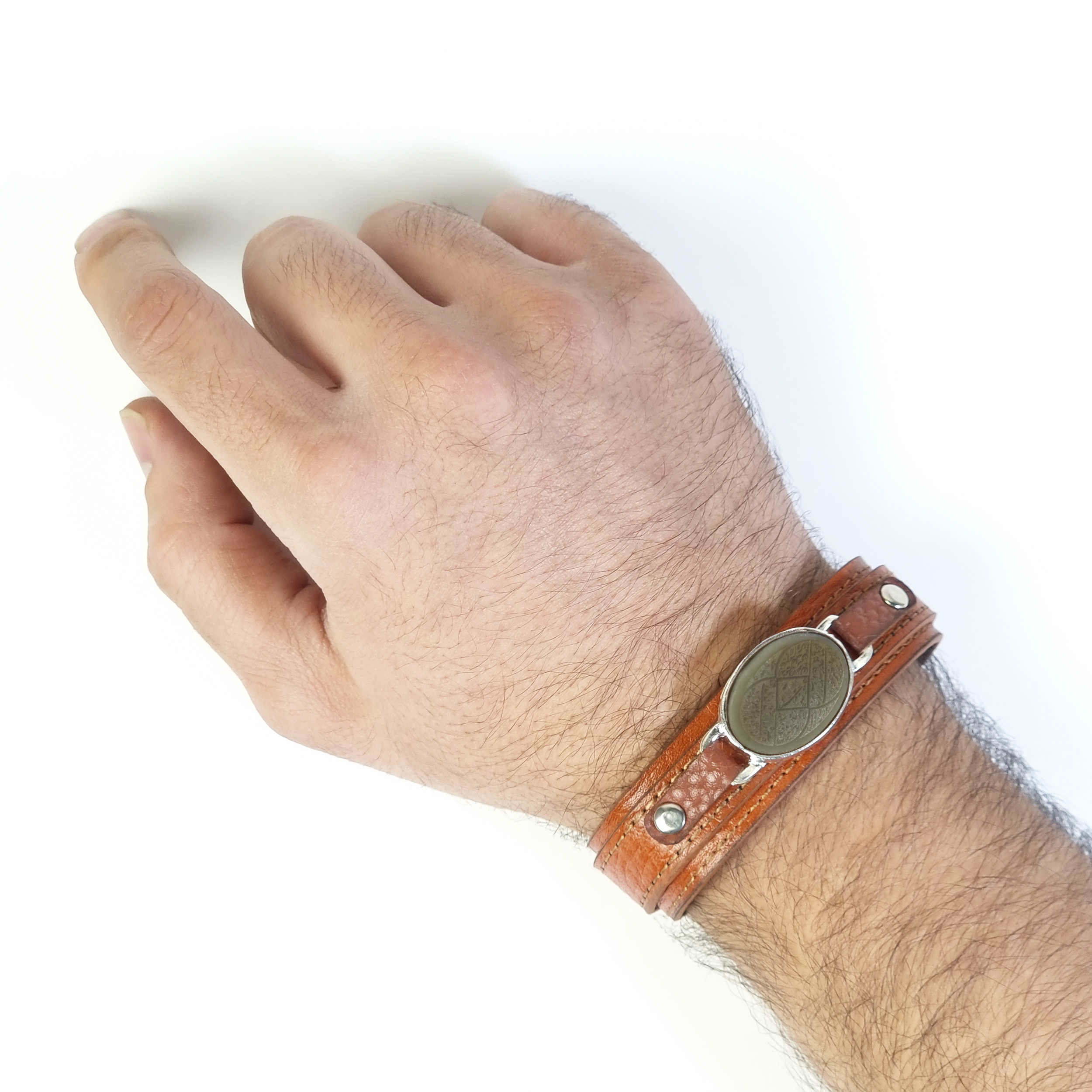 Elevate your style with our Islamic Leather Bracelet, meticulously crafted for men. This exquisite piece features a premium leather band, embodying strength and durability. At its heart lies a stunning jade stone, symbolizing purity and wisdom, seamlessly set to enhance its spiritual significance. The bracelet is adorned with intricate Islamic calligraphy, offering a touch of tradition and devotion. Designed for comfort and elegance, it complements both casual and formal attire. Perfect as a meaningful gift or a personal statement of faith, this bracelet is a timeless accessory for the modern Muslim man.