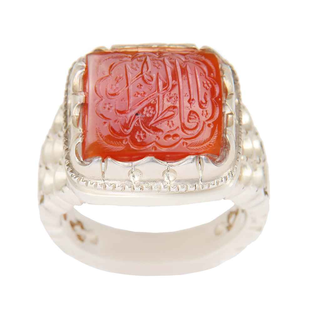 Condition New Product Type Yemeni Aqeeq Ring Pattern Ya Fatima al Zahra Gemstone Type Natural Origin Iran Design Islamic Size Multi-Size Suitable for Shia Muslims Gender Male Age Group Adult Material Silver Color Red