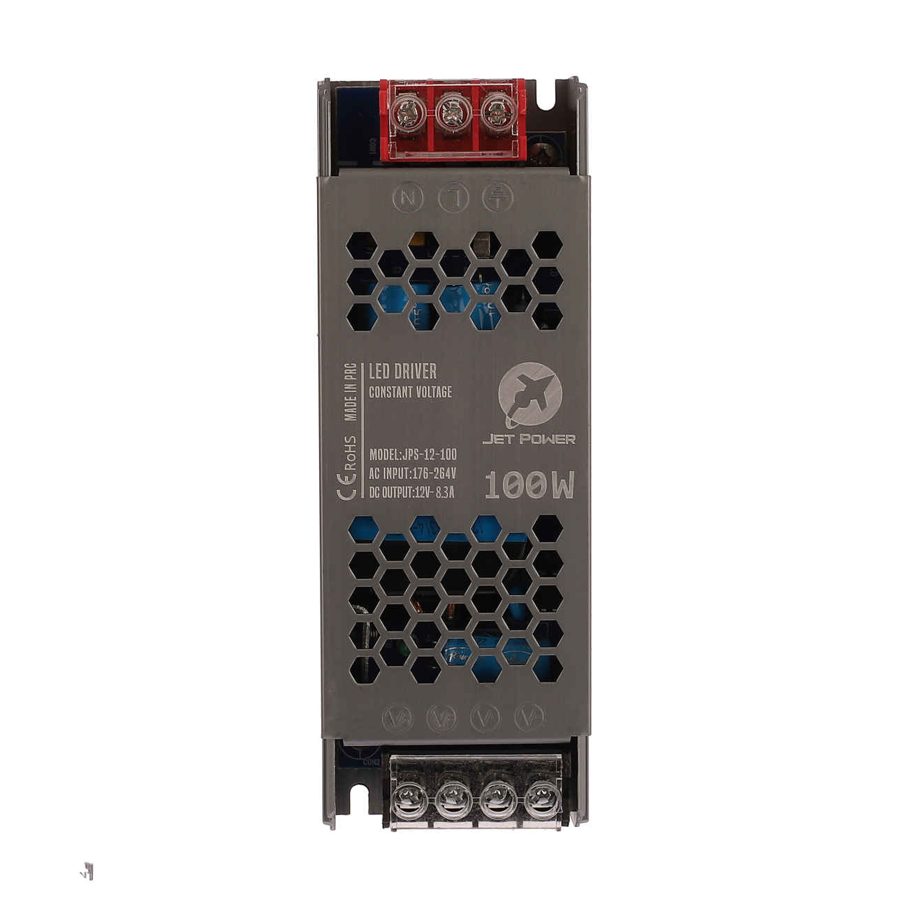 The Jet Power JPS-12-100 is a compact and efficient 12V 8.3A switching power adapter designed to deliver up to 100 watts of stable DC output for a variety of 12V devices. With its universal AC input range of 176–264V, it is ideal for international use and compatible with most electrical grids. Engineered for reliability and energy efficiency, this adapter is especially suitable for powering LED lighting systems, signage, low-voltage electronics, and other 12V DC loads that require up to 8.3 amps of current. Its slim, space-saving body (14 x 5 x 2.5 cm) and lightweight design (just 140g) make it easy to integrate into compact enclosures or tight installations. Featuring switching technology, the JPS-12-100 provides low heat generation, stable voltage output, and enhanced safety, ensuring the long-term performance of your LED setups and other connected devices.