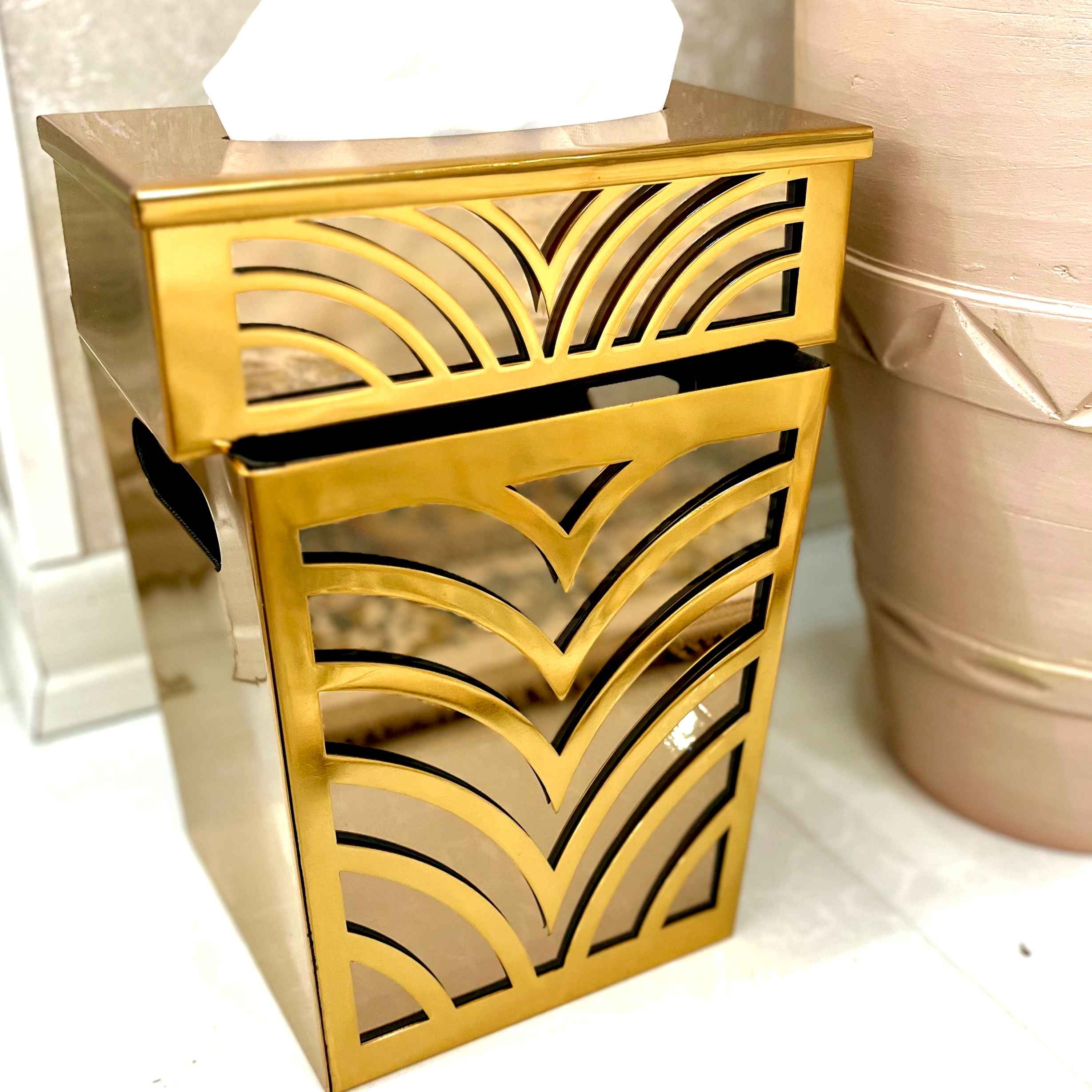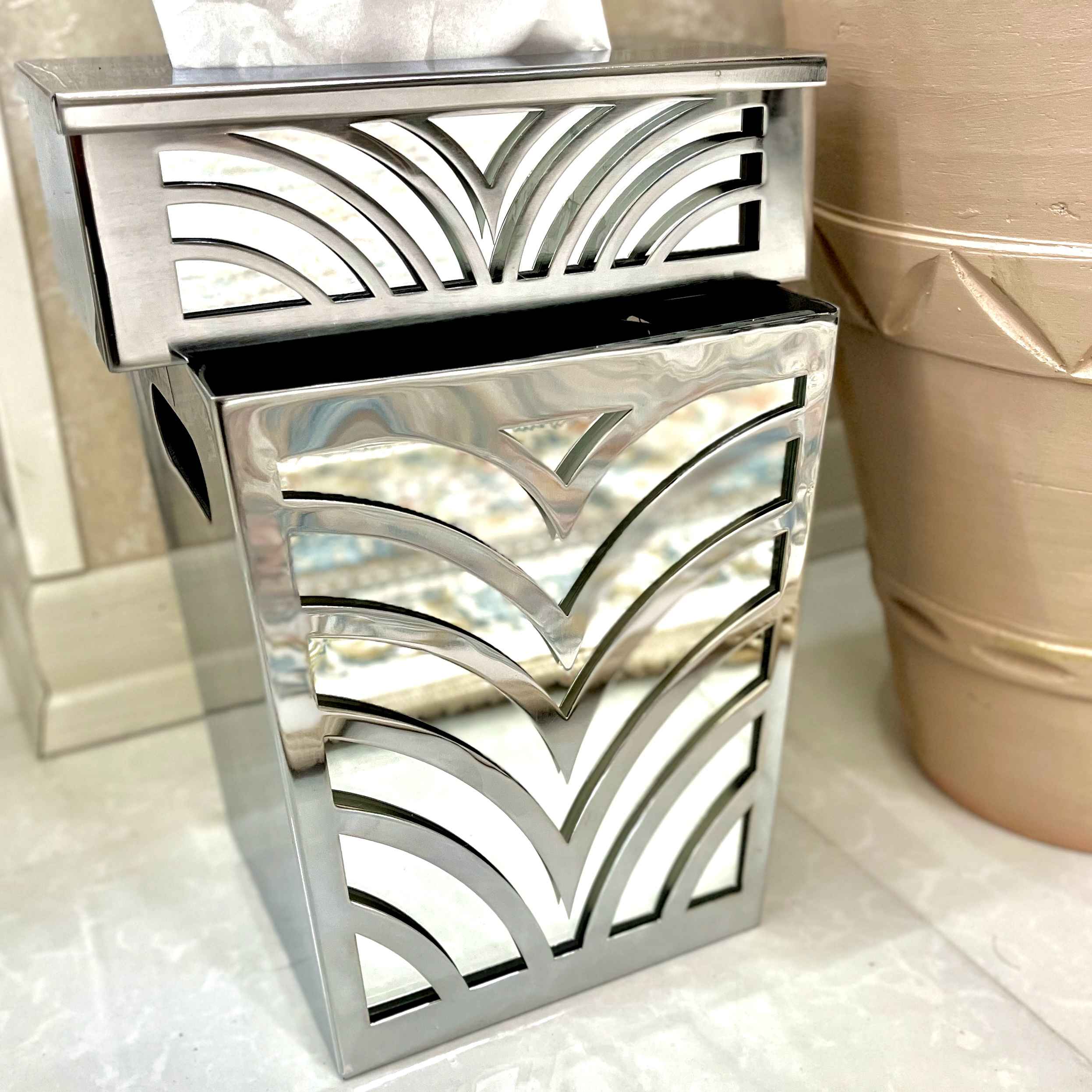 Introducing our practical Waste Basket with Tissue Cover set, expertly crafted from durable Metal & Mirror & Wood for a perfect blend of convenience and reliability. Designed to enhance your living spaces, this set offers a clean and harmonious look with its sleek waste basket, while the tissue cover adds a decorative element while keeping tissues organized. The Metal & Mirror & Wood material ensures longevity and easy maintenance, making it ideal for everyday use. The set boasts intricate patterns, bringing a touch of sophistication suitable for various home decor styles. Choose from a variety of designs and colors to effortlessly elevate your home decor and enjoy the convenience of a clutter-free living space. Transform your surroundings with this Metal & Mirror & Wood Waste Basket and Tissue Cover set – where practicality meets style.