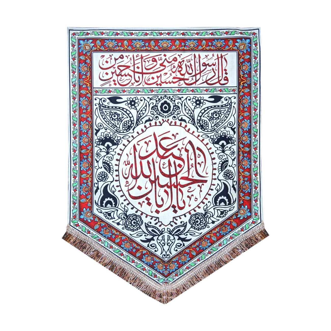 This Islamic flag is a beautifully crafted wall tapestry featuring intricate Arabic calligraphy, set against a vibrant floral and geometric border design. The central portion showcases the name of Imam Hussain (ع), a revered figure in Islamic history, written in an elaborate red script within a circular frame, symbolizing his nobility and sacrifice. Surrounding this, the floral motifs in black and white provide a rich contrast to the red text, while the detailed border combines traditional Islamic patterns with colors of red, blue, and green, adding a touch of elegance. The top section of the flag contains additional Arabic calligraphy, likely from a Quranic verse or a well-known Islamic saying, honoring the virtues of patience, courage, and devotion that Imam Hussain (ع) exemplified during the events of Karbala.