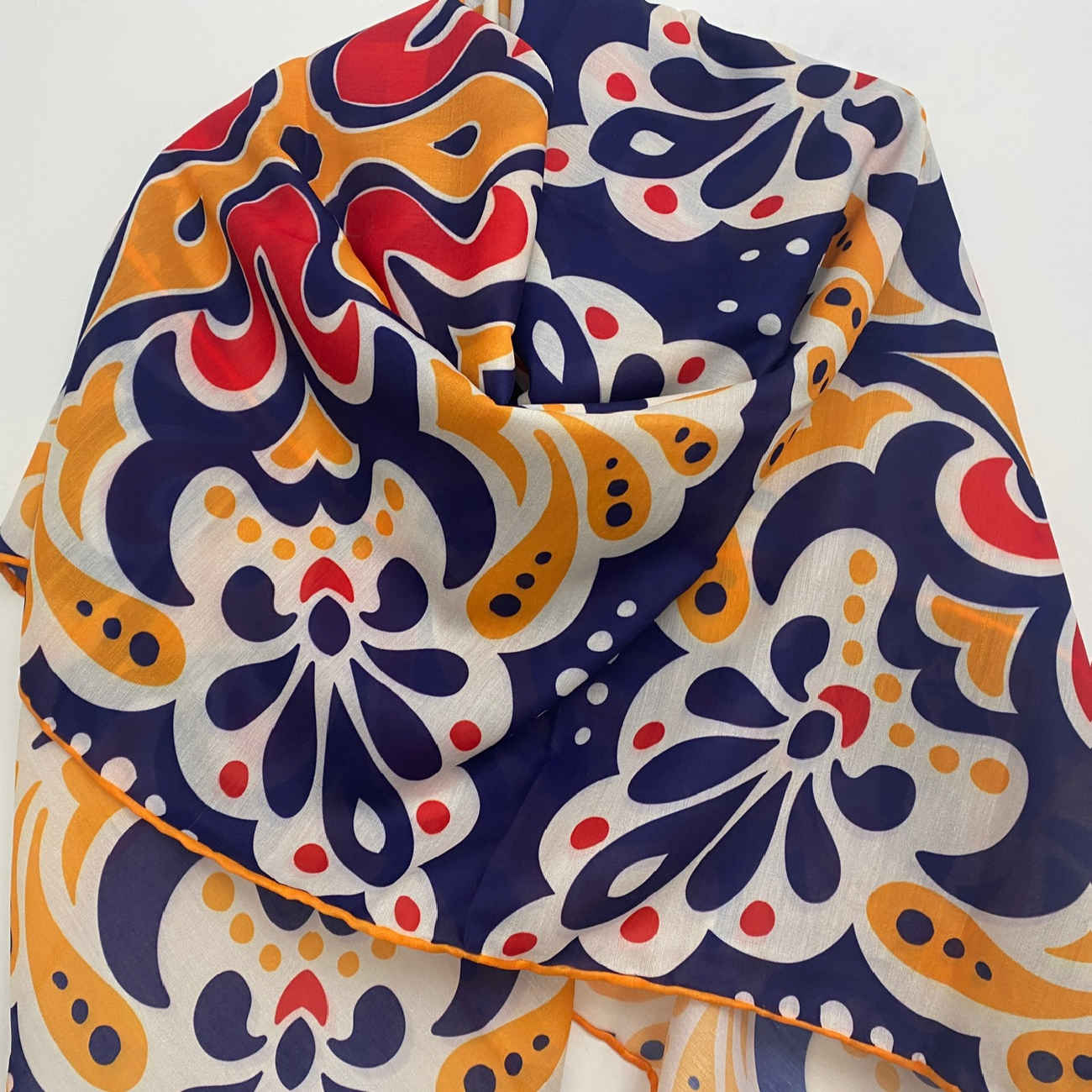 Add a touch of elegance to your wardrobe with this beautifully designed scarf in deep navy blue. Made from soft, breathable cotton, it’s perfect for layering throughout the year—offering comfort in chilly weather and light coverage on breezy summer days. The scarf features a striking floral pattern that stands out against the rich navy background. The detailed blossoms bring a refined, artistic feel, making it a versatile accessory that pairs effortlessly with both casual and dressy outfits. Whether worn loosely draped or wrapped snugly, it adds an instant style upgrade.Designed for timeless appeal, this piece is as practical as it is beautiful. Lightweight yet durable, it’s ideal for daily wear or special occasions. Its classic color and graceful floral motif make it a wardrobe staple you’ll reach for season after season.