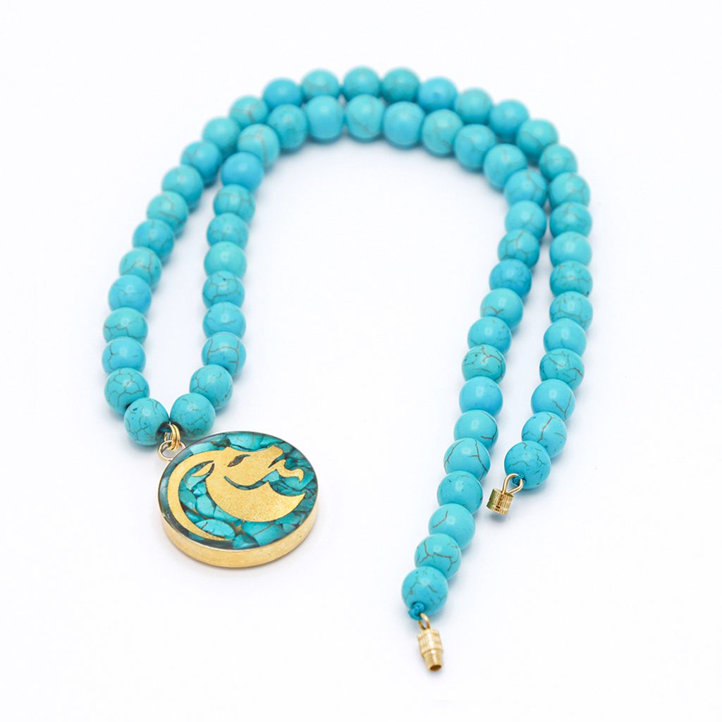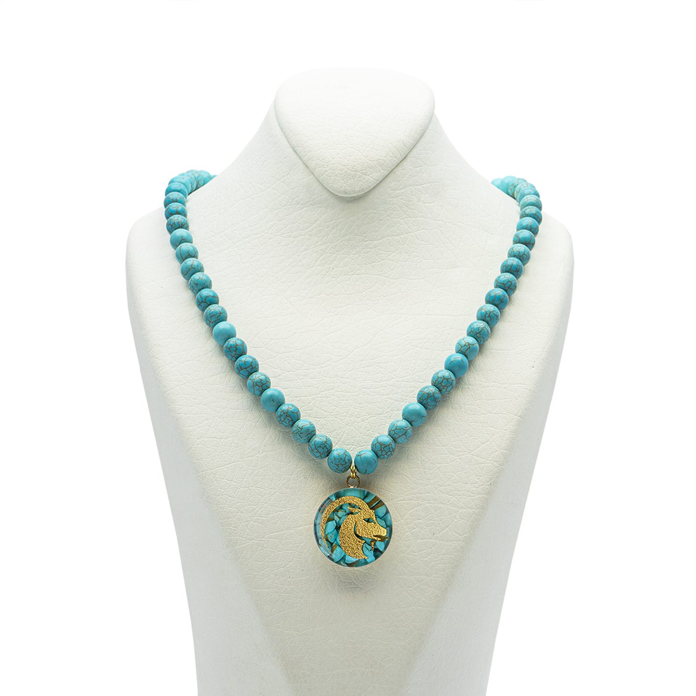 Nishapour Turquoise Necklace Featuring Zodiac Gold Leaf Design – Capricorn (Dey). Experience the fusion of Persian artistry and the timeless charm of turquoise, a gemstone admired for its vivid color and soothing properties, sourced from the historic Nishapur mines of Iran. Each necklace is handcrafted with precision, showcasing a 24k gold leaf Capricorn symbol that embodies discipline, ambition, and responsibility—the core traits of the Capricorn sign. The blend of natural turquoise and sleek resin coating offers a modern yet classic aesthetic, making it an ideal accessory for both casual and elegant occasions. A thoughtful and luxurious gift, this piece honors the spirit of ‘Dey’—a celebration of perseverance, wisdom, and steady growth inspired by Iranian heritage. Note: The turquoise stones inside the pendant are genuine and from Nishapur, while the turquoise stones around the necklace chain are genuine but not from Nishapur.