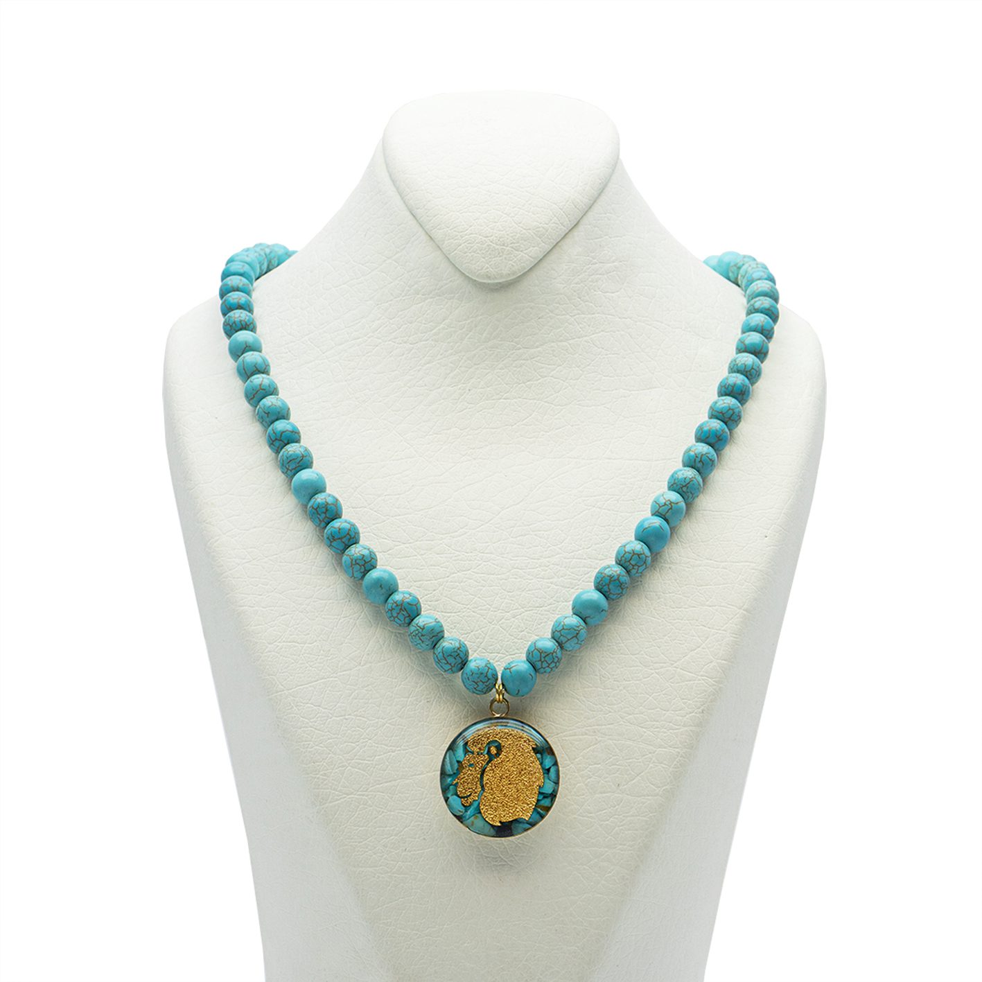 Nishapour Turquoise Necklace Featuring Zodiac Gold Leaf Design – Leo (Mordad). Experience the fusion of Persian artistry and the timeless charm of turquoise, a gemstone admired for its vivid color and soothing properties, sourced from the historic Nishapur mines of Iran. Each necklace is handcrafted with precision, showcasing a 24k gold leaf Leo symbol that embodies strength, confidence, and creativity—the core traits of the Leo sign. The blend of natural turquoise and sleek resin coating offers a modern yet classic aesthetic, making it an ideal accessory for both casual and elegant occasions. A thoughtful and luxurious gift, this piece honors the spirit of ‘Mordad’—a celebration of leadership, warmth, and vitality inspired by Iranian heritage. Note: The turquoise stones inside the pendant are genuine and from Nishapur, while the turquoise stones around the necklace chain are genuine but not from Nishapur.