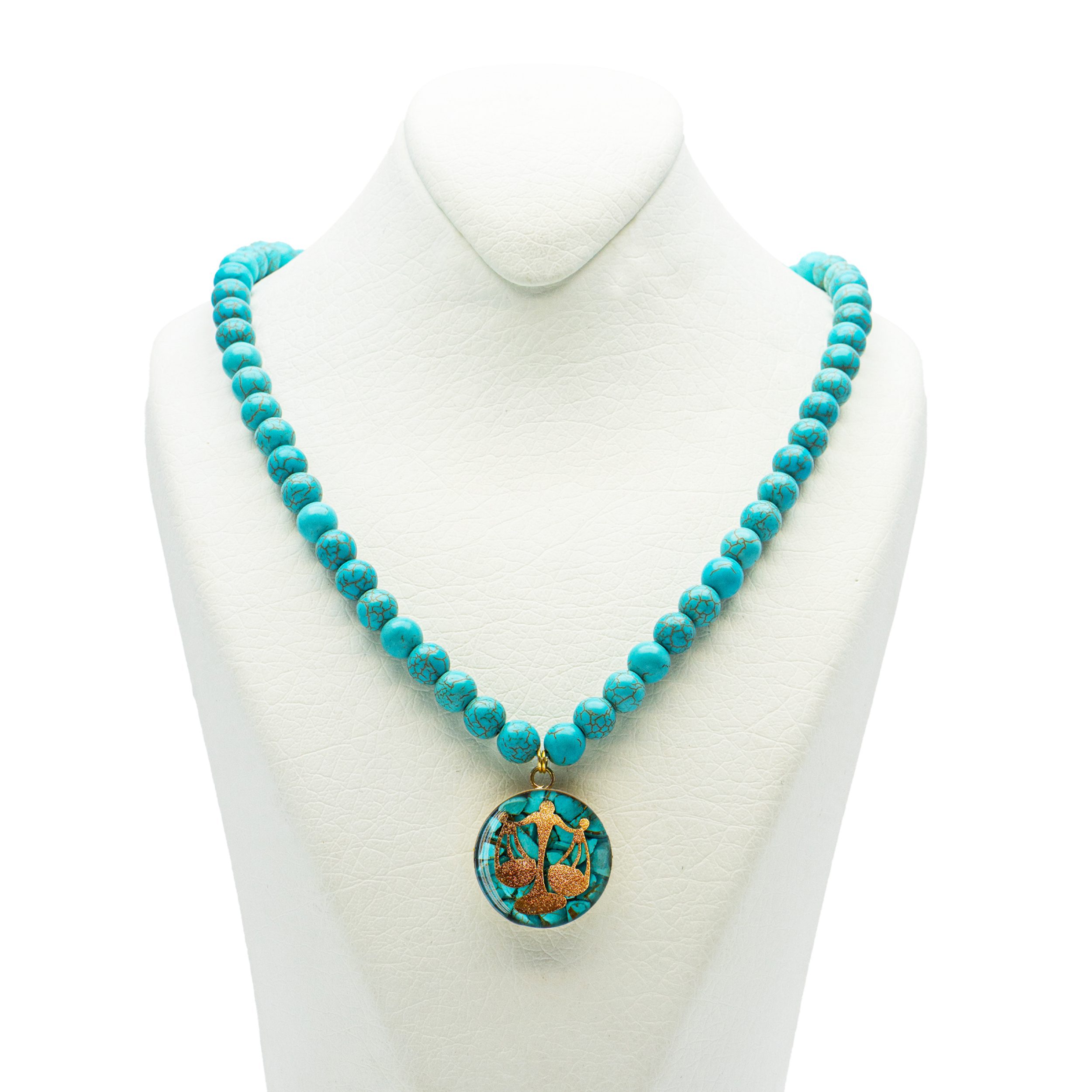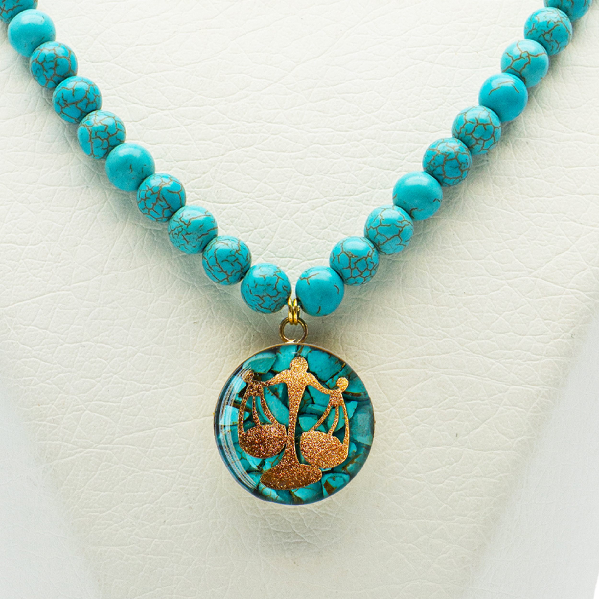 Nishapour Turquoise Necklace Featuring Zodiac Gold Leaf Design – Libra (Mehr). Experience the fusion of Persian artistry and the timeless charm of turquoise, a gemstone admired for its vivid color and soothing properties, sourced from the historic Nishapur mines of Iran. Each necklace is handcrafted with precision, showcasing a 24k gold leaf Libra symbol that embodies balance, harmony, and elegance—the core traits of the Libra sign. The blend of natural turquoise and sleek resin coating offers a modern yet classic aesthetic, making it an ideal accessory for both casual and elegant occasions. A thoughtful and luxurious gift, this piece honors the spirit of ‘Mehr’—a celebration of fairness, beauty, and social grace inspired by Iranian heritage. Note: The turquoise stones inside the pendant are genuine and from Nishapur, while the turquoise stones around the necklace chain are genuine but not from Nishapur.