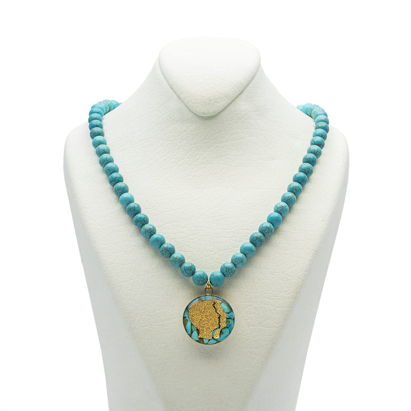Nishapour Turquoise Necklace with Zodiac Gold Leaf – Gemini ‘Khordad’ Design. Experience the fusion of Persian artistry and the timeless charm of turquoise, a gemstone admired for its vivid color and soothing properties, sourced from the historic Nishapur mines of Iran. Each necklace is handcrafted with precision, showcasing a 24k gold leaf Gemini symbol that embodies duality, intellect, and creativity—the core traits of the Gemini sign. The blend of natural turquoise and sleek resin coating offers a modern yet classic aesthetic, making it an ideal accessory for both casual and elegant occasions. A thoughtful and luxurious gift, this piece honors the spirit of ‘Khordad’—a celebration of communication, versatility, and harmony inspired by Iranian heritage. Note: The turquoise stones inside the pendant are genuine and from Nishapur, while the turquoise stones around the necklace chain are genuine but not from Nishapur.