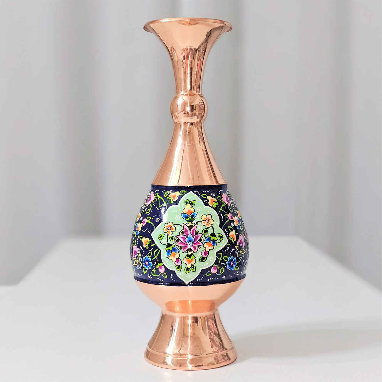 Bring timeless Persian artistry into your home with this Pardaz Decorative Copper Vase, an artisan handcrafted piece adorned with traditional Minakari enamel. Expertly painted on a copper base, this vase reflects the beauty of “Mes-o-Pardaz,” a unique craft that combines the strength of copper with the elegance of enamel decoration. Its graceful silhouette and intricate detailing make it a striking statement piece that adds depth and cultural richness to any interior. Crafted from high-quality copper and finished with meticulous hammering, this vase showcases both durability and elegance. Measuring 8.5 x 8.5 x 25 cm and weighing 350 grams, it is perfectly sized for tabletops, shelves, or display cabinets. The surface is enhanced with hand-painted floral patterns, a hallmark of Persian Minakari art, transforming the vase into more than just a decorative object—it becomes a reflection of heritage and craftsmanship. Handmade in Isfahan, a city celebrated for centuries of exceptional metalwork, this copper vase is ideal for collectors, art lovers, or anyone seeking a sophisticated accent for their home. Whether displayed alone or as part of a curated arrangement, it elevates your décor with authenticity and elegance, making it a meaningful gift or centerpiece for any occasion.