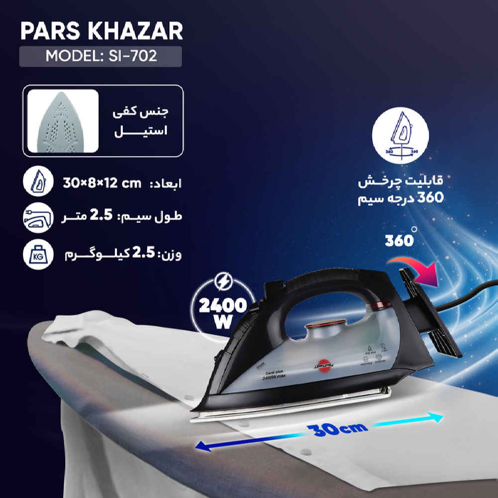 Experience the pinnacle of garment care with the Pars Khazar Steam Iron. Its sleek Crafted with a durable steel plate, this steam iron effortlessly navigates fabrics, offering adjustable steam levels and a continuous steam output for seamless results. Safety is paramount, featuring an auto shut-off system for peace of mind. The ergonomic design includes a soft-covered handle and a 360-degree swivel cord for smooth movement. With a water tank capacity of 300 ml, the Pars Khazar Steam Iron strikes the perfect balance between power and precision. Embrace excellence in garment care with this masterpiece that combines form, function, and innovation.
