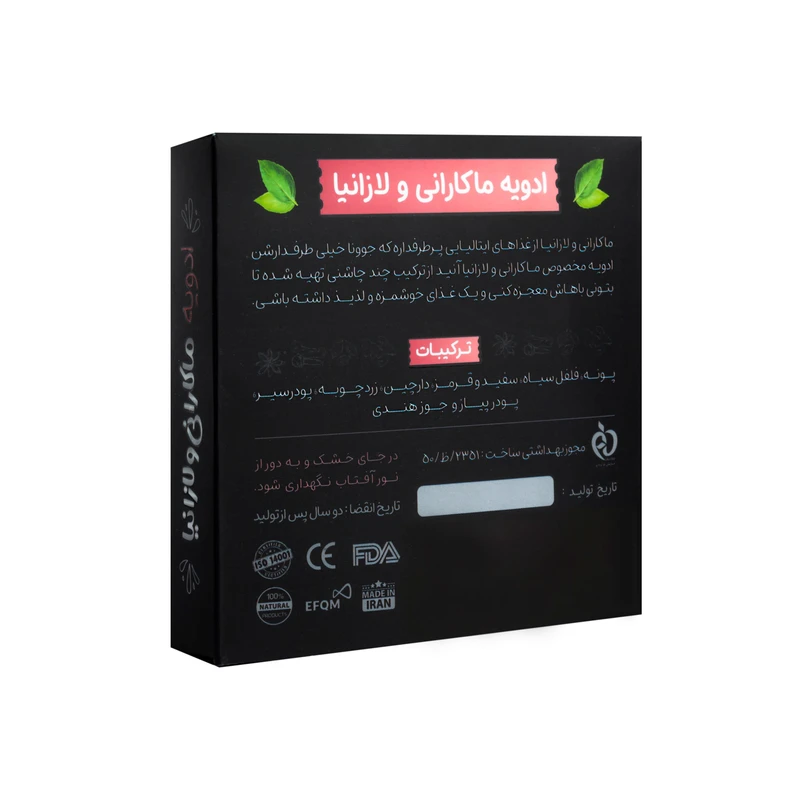 Enhance your pasta dishes with this rich and aromatic spice blend. Specially crafted for macaroni and lasagna, it adds a bold Persian-inspired flavor to your meals. A perfect mix of herbs and spices brings warmth and depth to every bite. Designed for convenience, it ensures consistent taste in every dish. Ideal for home cooks and professional chefs alike. Elevate your Italian recipes with a unique Middle Eastern twist. Perfect for seasoning pasta sauces, baked lasagna, and even casseroles. Easy to use—just sprinkle and mix for an instant flavor boost. Balanced spice levels suit a variety of palates. No artificial flavors or preservatives, just pure, natural ingredients. Great for family dinners, gatherings, and special occasions. A must-have pantry staple for pasta lovers. Comes in a handy pack, ensuring long-lasting use. Delightful aroma and rich taste make every meal special. Enjoy restaurant-quality flavor in the comfort of your home.