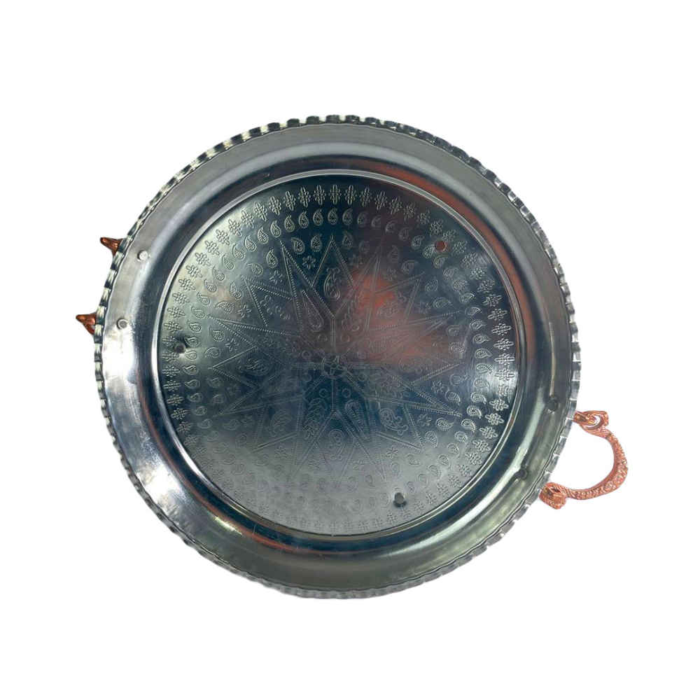 Indulge in the artistry and functionality of our Handcrafted Copper Serving Platter, meticulously hammered and brought to life by skilled Iranian artisans. This elegant platter isn’t just a serving piece; it’s a testament to tradition and meticulous craftsmanship. The hammered copper surface exudes sophistication and offers a unique texture that adds a touch of refinement to any occasion. Perfect for showcasing a delightful array of fruits, desserts, or sweets, this handcrafted platter elevates your presentation. Its generous size and elegant design make it an ideal canvas for displaying an assortment of colorful fruits, delectable desserts, or a medley of tantalizing sweets. Elevate your table setting with this artisanal masterpiece, where tradition meets modern elegance, enhancing every culinary presentation with a touch of cultural sophistication.