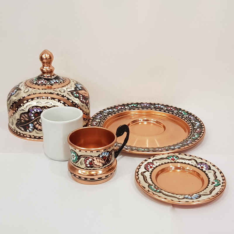 Elevate your coffee serving experience with our exquisite Set of Persian Minakari Coffee Cups with Saucers. Handcrafted to perfection, each cup and saucer is meticulously made on copper using the traditional engraving method, showcasing the intricate beauty of Persian Minakari artistry. This luxurious set is a testament to sophistication, designed for those who appreciate the finer things in life. Crafted with care and attention to detail, this handmade set exudes opulence and elegance, making it a statement piece for any coffee aficionado’s collection. To preserve its beauty, simply clean with cold water and a soft, damp cloth, avoiding the use of strong or weak detergents that may harm the copper. Treat yourself or a loved one to the ultimate coffee serving experience with our Set of Persian Minakari Coffee Cups with Saucers, where luxury meets tradition in every sip.