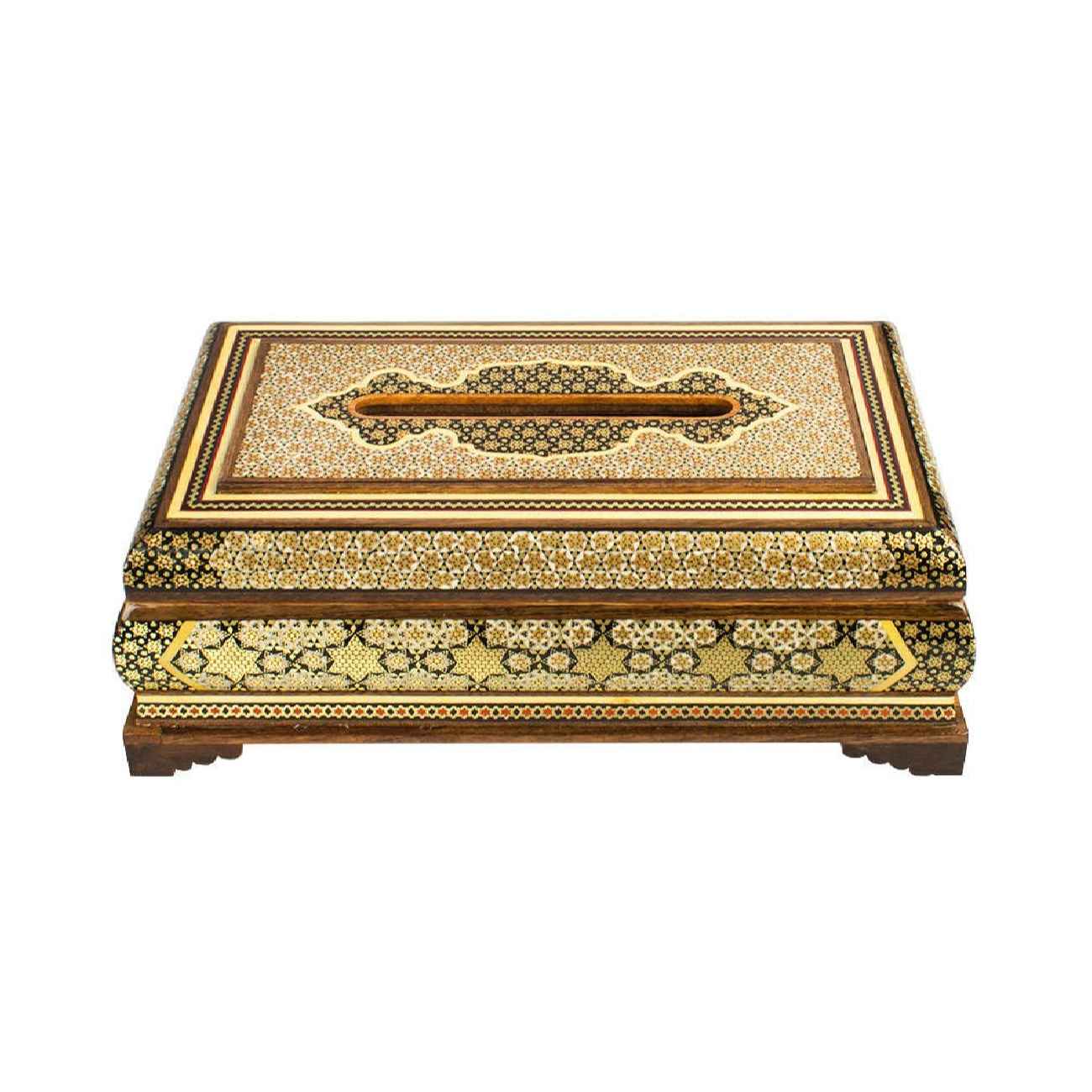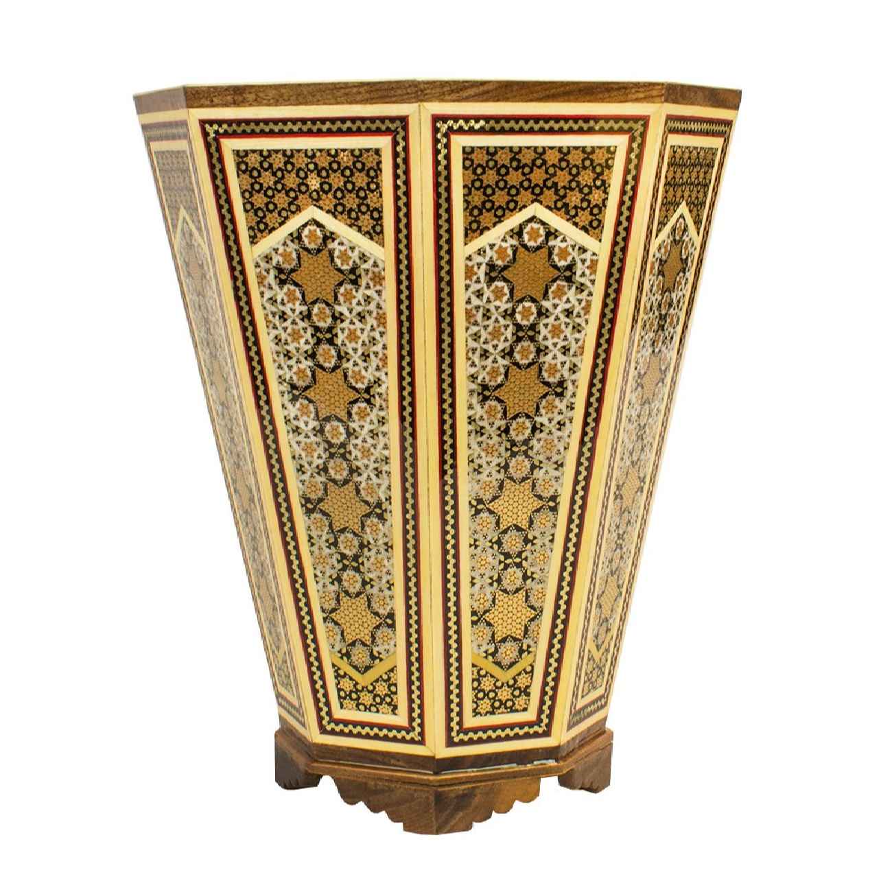 This elegant set includes a waste basket and tissue box, both showcasing the exquisite art of Khatamkari, a traditional Persian craft known for its intricate inlay work. Each piece is meticulously handcrafted, featuring geometric patterns made from fine materials like wood, bone, and brass. The delicate craftsmanship reflects centuries of artistic heritage, creating a striking balance between beauty and functionality. The waste basket and tissue box offer a luxurious touch to any room, from living spaces to offices. Their timeless design complements both modern and classic décor, making them not just practical accessories but also pieces of art that elevate your surroundings. This set celebrates Persian artisanship, offering a blend of tradition and elegance that will captivate any connoisseur of fine decor.