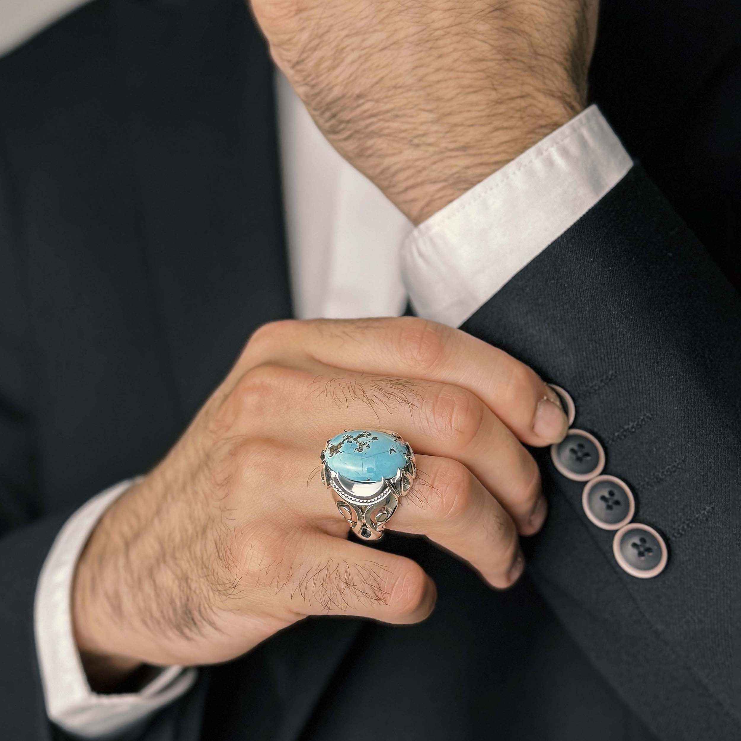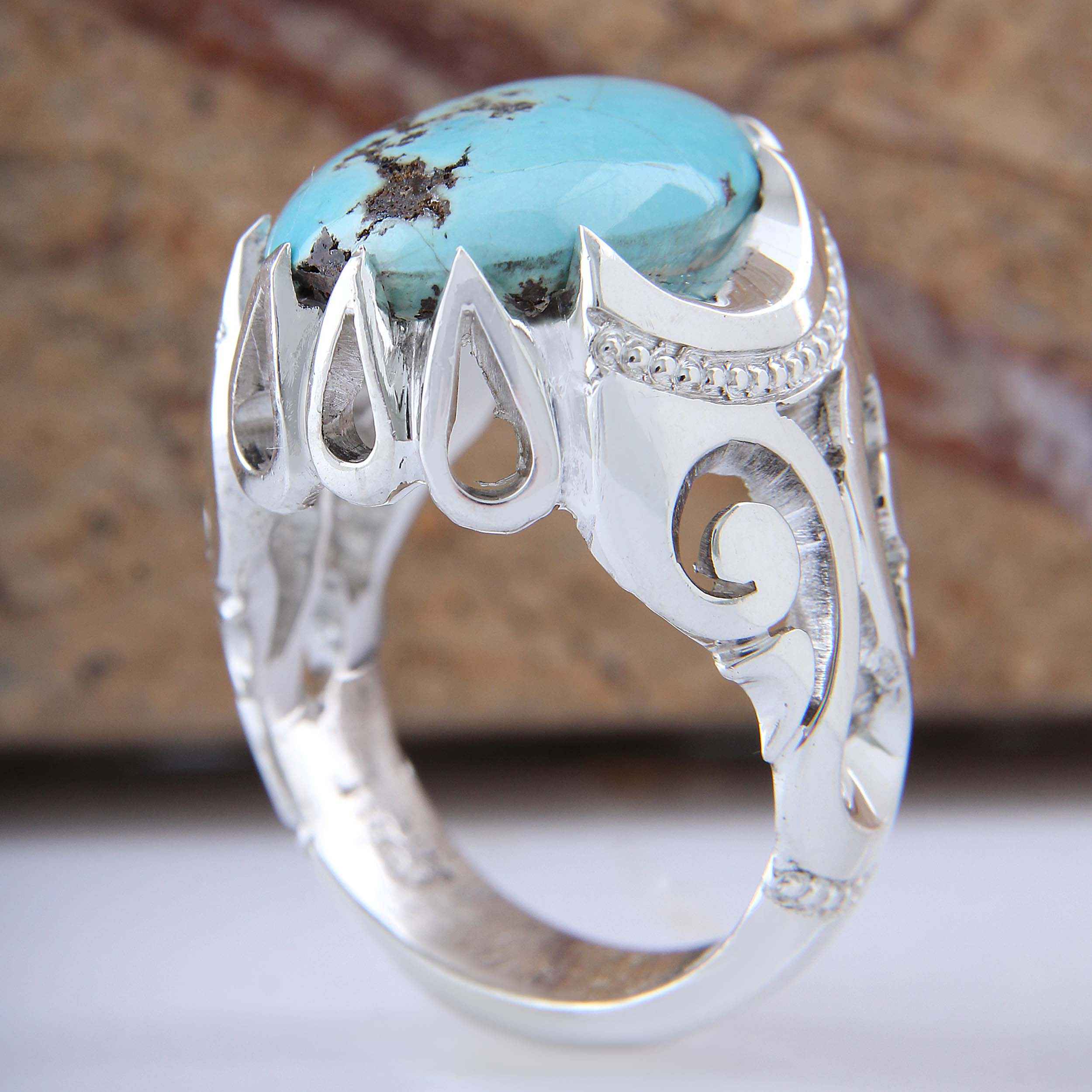 Step into a realm of enchantment with our Persian Neyshabur Turquoise Silver Ring, a true testament to artisanal mastery. Adorned with a radiant Neyshabur Turquoise stone, affectionately known as Firoze, Feroza, or Firoozeh, this ring embodies the opulent heritage of Persia. Meticulously crafted by hand, each detail from the intricately engraved silver band to the graceful Turquoise centerpiece exudes unparalleled artistry. Our artisans infuse dedication and skill into every piece, ensuring uniqueness and exquisite beauty. All of our Neyshabur Turquoise Silver Rings come with a certification, ensuring authenticity and quality. Embrace the allure of Persian culture and the timeless charm of Turquoise with this handcrafted masterpiece. Elevate your style with an elegant touch that transcends fleeting trends, promising enduring sophistication.