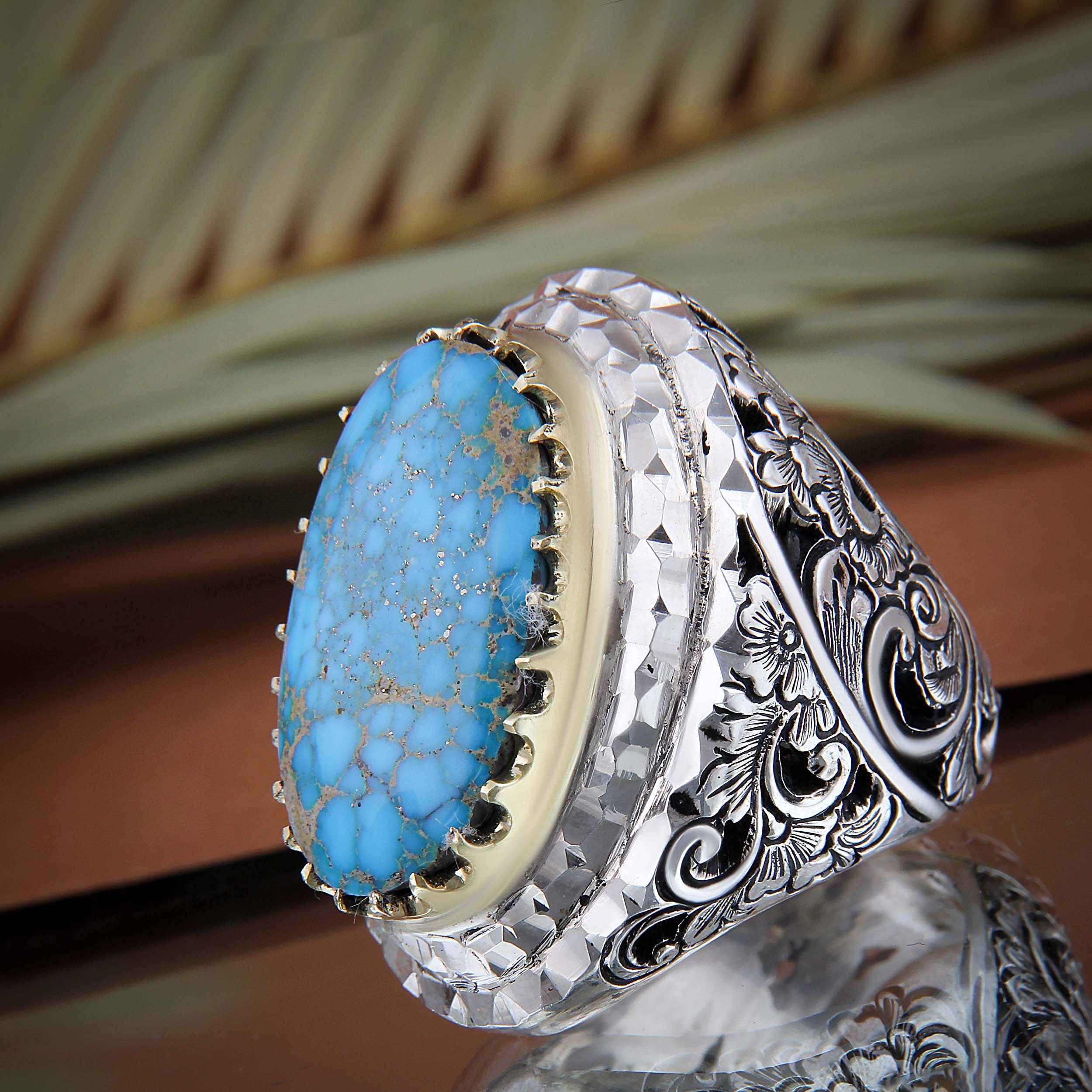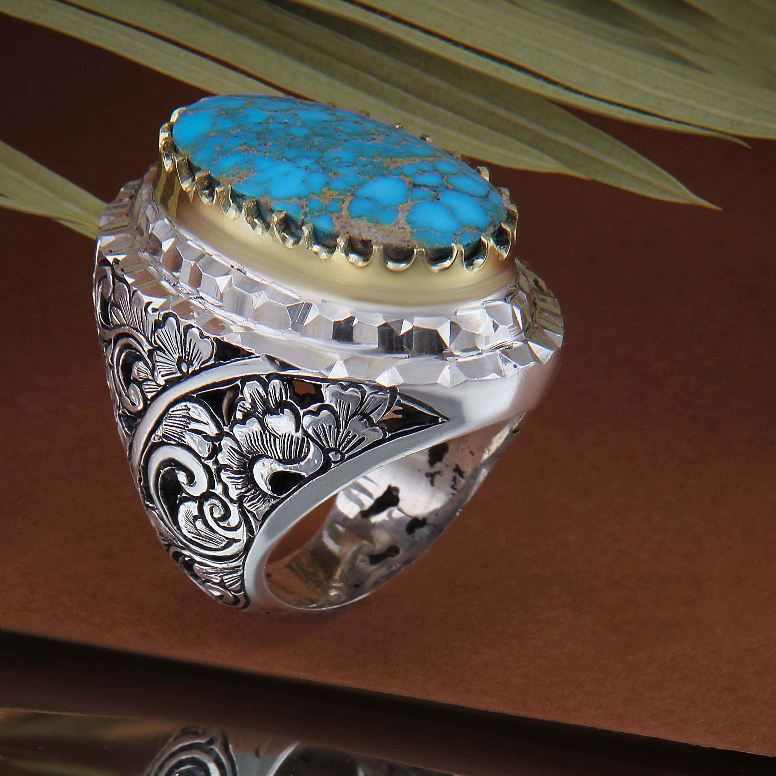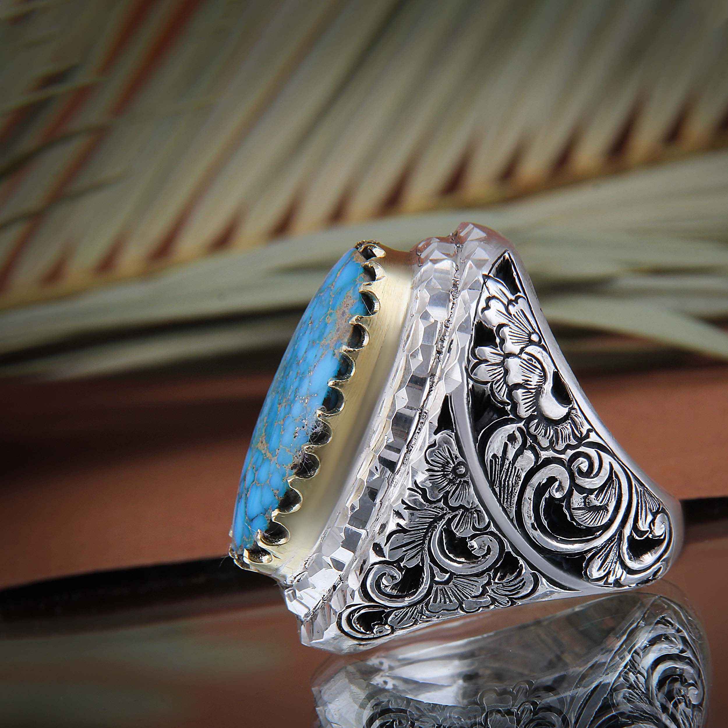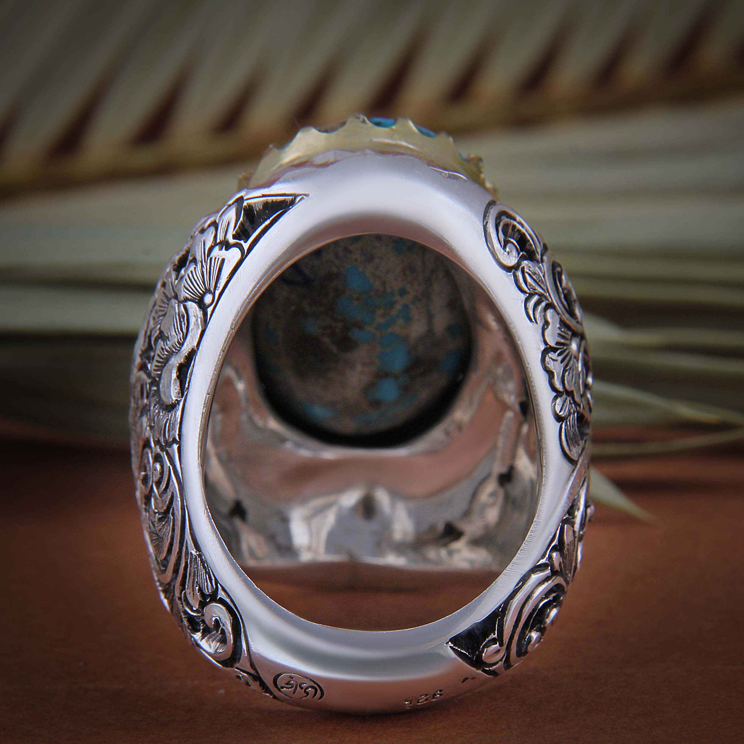Step into a realm of enchantment with our Persian Neyshabur Turquoise Silver Ring, a true testament to artisanal mastery. Adorned with a radiant Neyshabur Turquoise stone, affectionately known as Firoze, Feroza, or Firoozeh, this ring embodies the opulent heritage of Persia. Meticulously crafted by hand, each detail from the intricately engraved silver band to the graceful Turquoise centerpiece exudes unparalleled artistry. Our artisans infuse dedication and skill into every piece, ensuring uniqueness and exquisite beauty. All of our Neyshabur Turquoise Silver Rings come with a certification, ensuring authenticity and quality. Embrace the allure of Persian culture and the timeless charm of Turquoise with this handcrafted masterpiece. Elevate your style with an elegant touch that transcends fleeting trends, promising enduring sophistication.