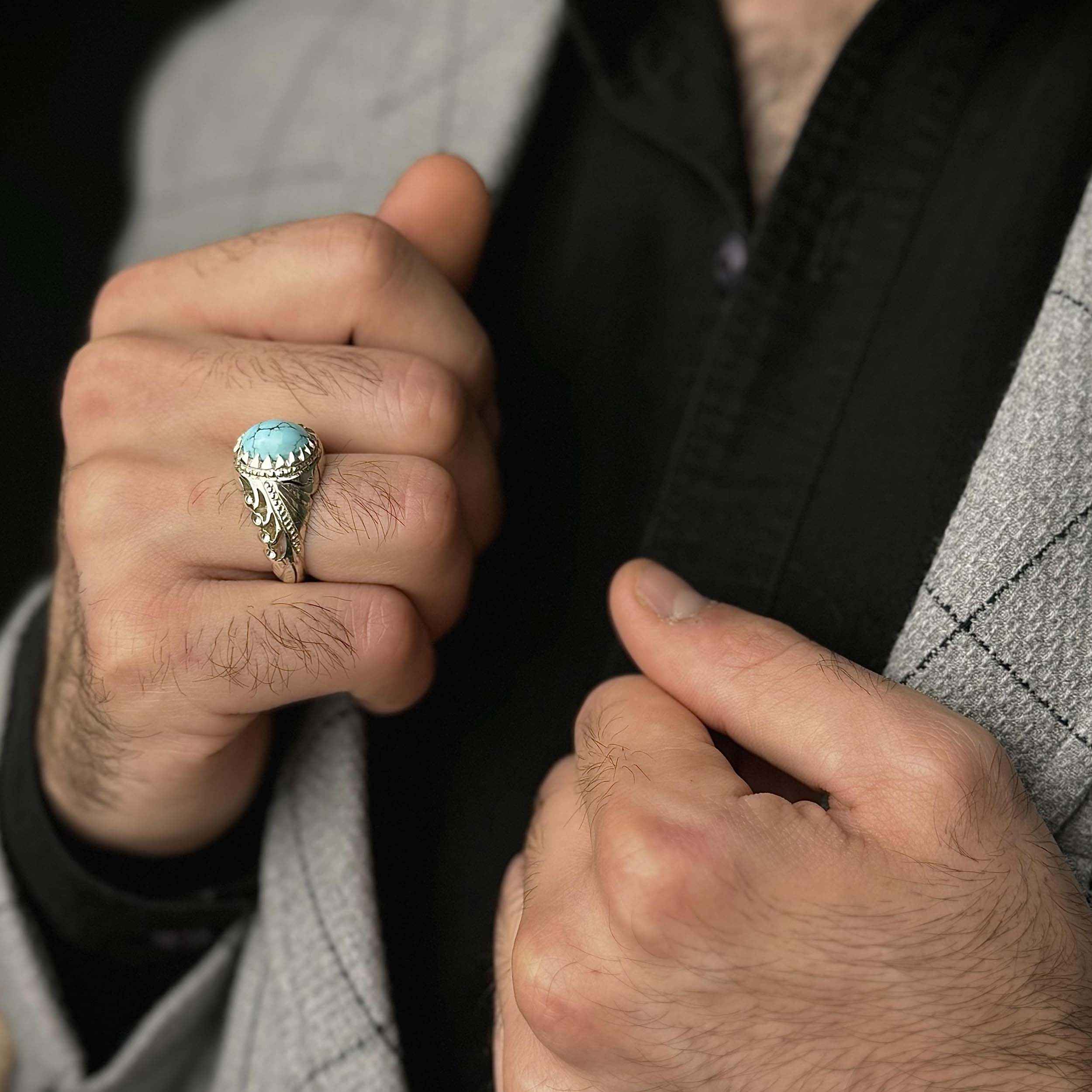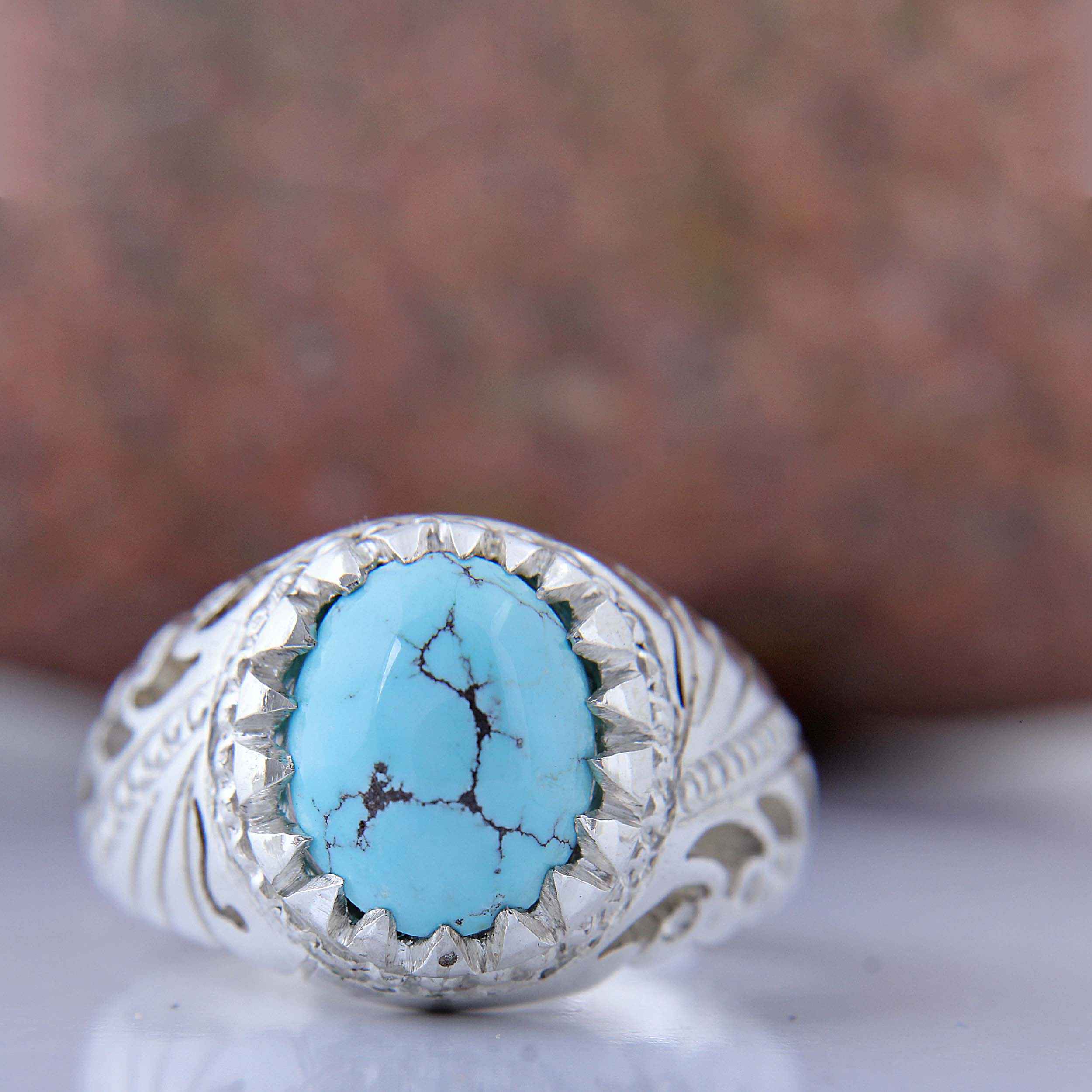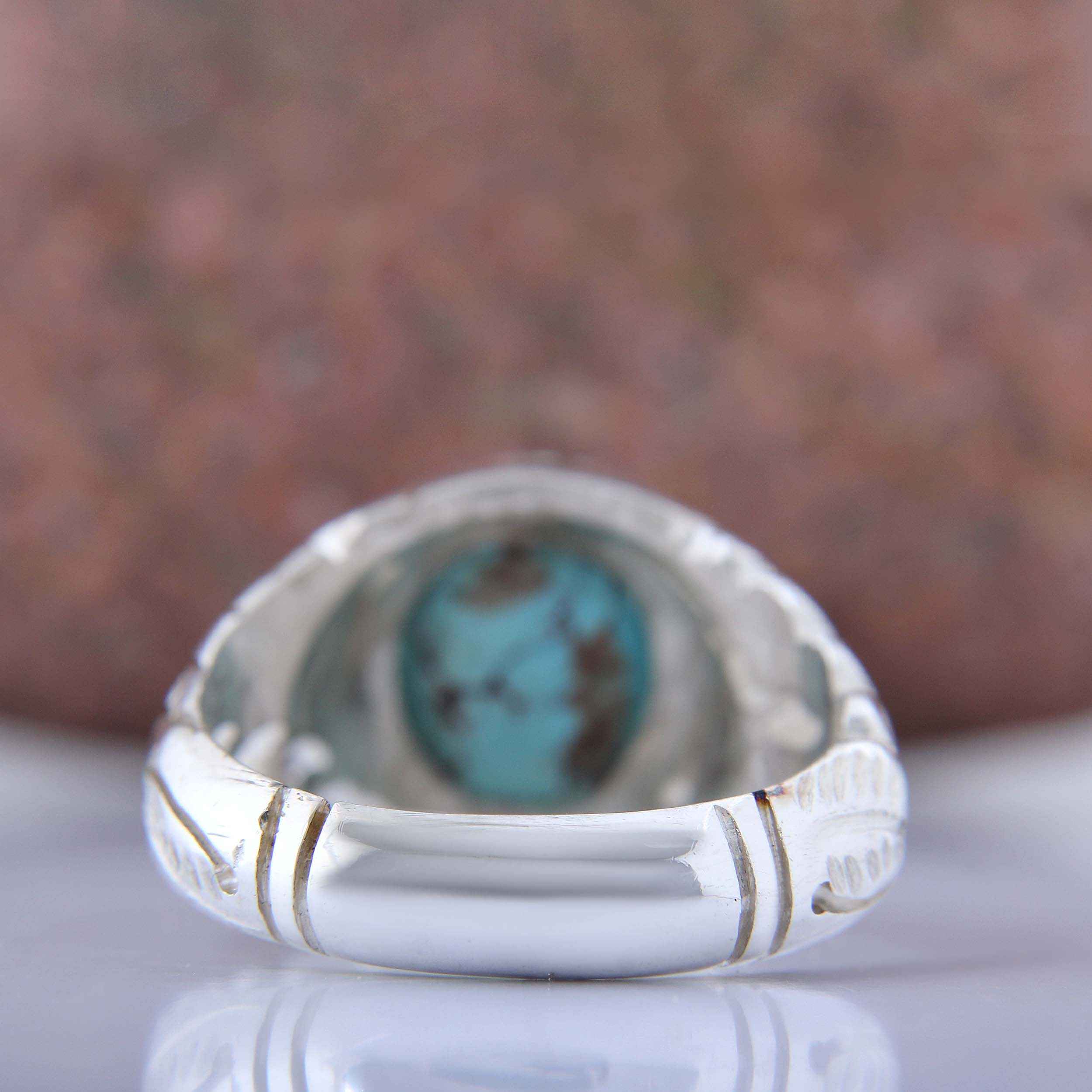 Weight 9.55 g Product Type Turquoise Ring Gemstone Type Natural Origin Iran Gemstone Neyshabur Turquoise Material Sterling Silver Design Traditional Persian Style Elegance Gender Male Age Group Adult Color Cyan Occasion Ceremony, Formal Events Size 9
