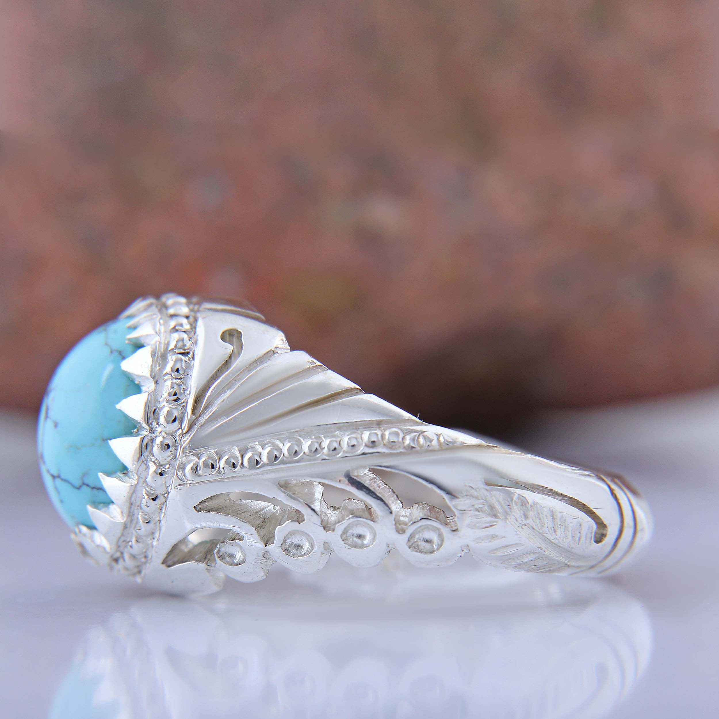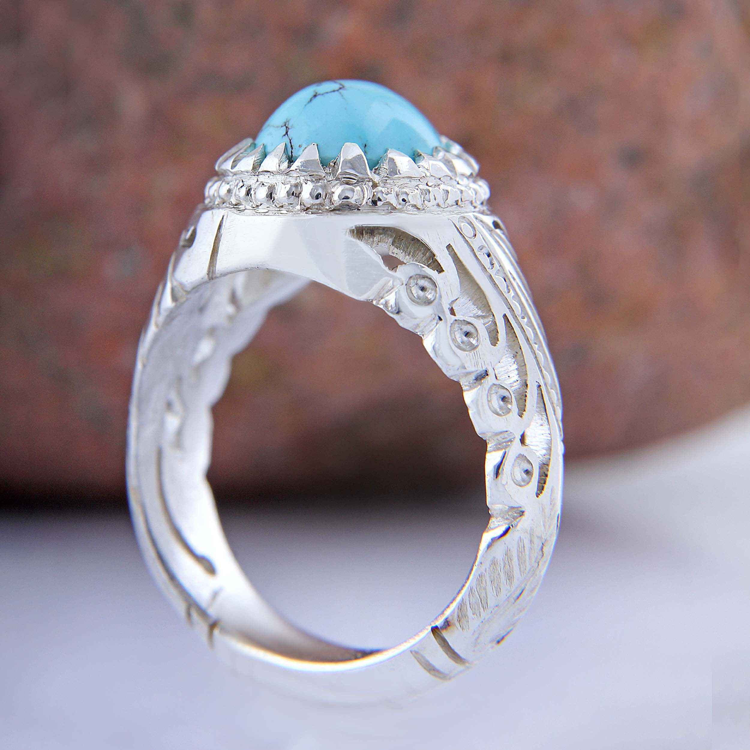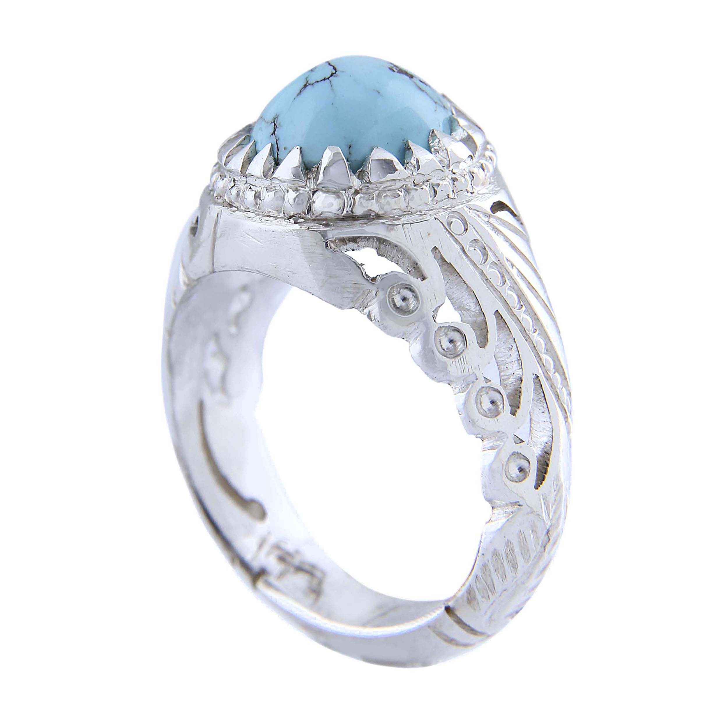 Weight 9.55 g Product Type Turquoise Ring Gemstone Type Natural Origin Iran Gemstone Neyshabur Turquoise Material Sterling Silver Design Traditional Persian Style Elegance Gender Male Age Group Adult Color Cyan Occasion Ceremony, Formal Events Size 9