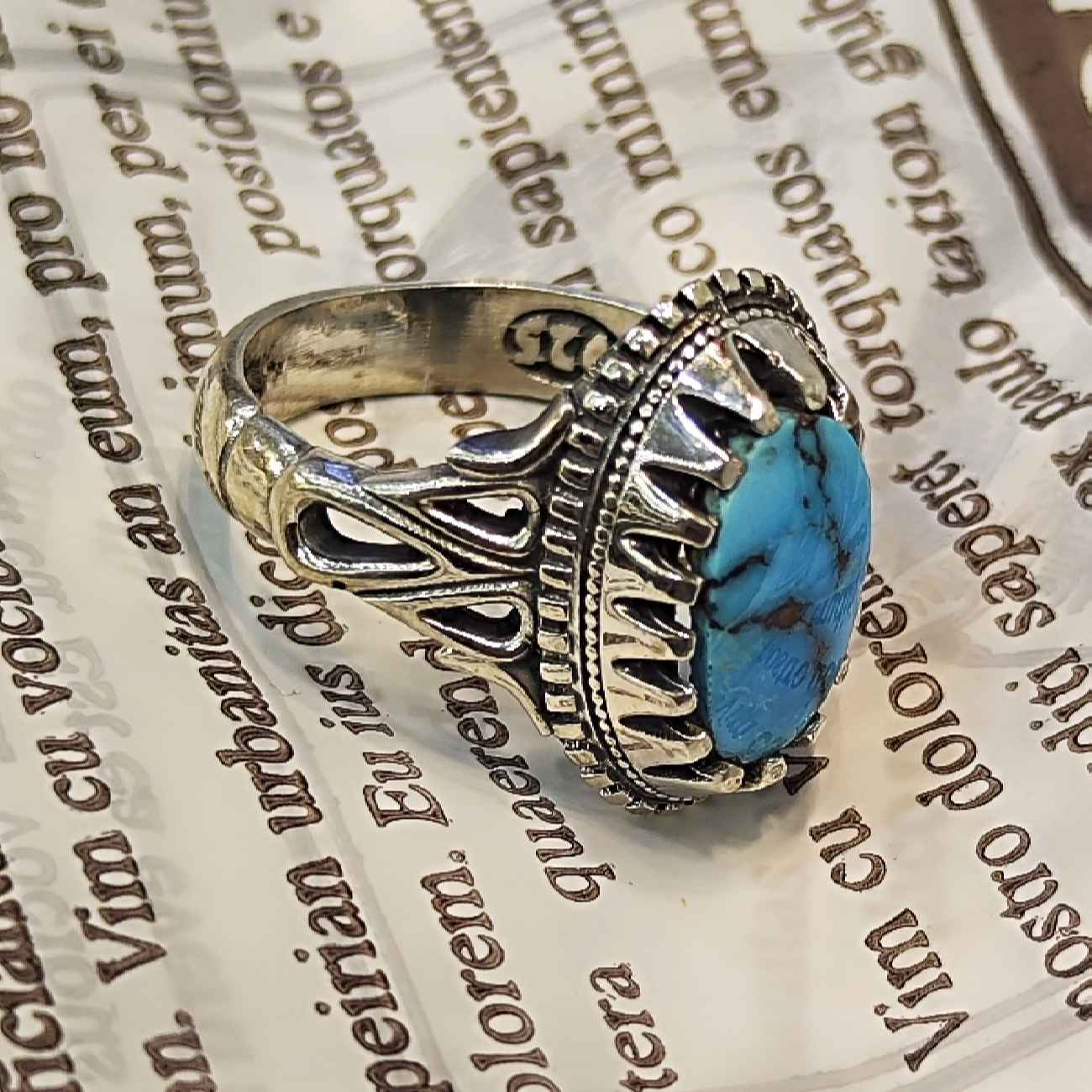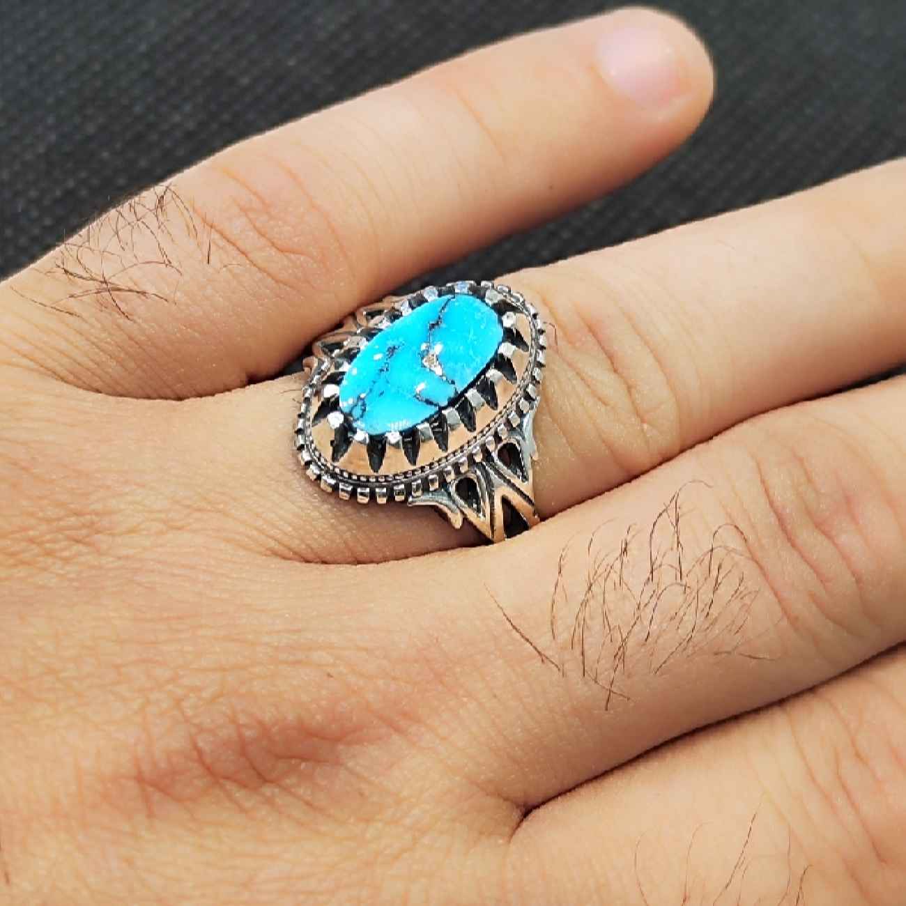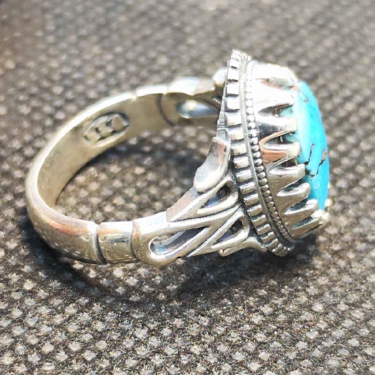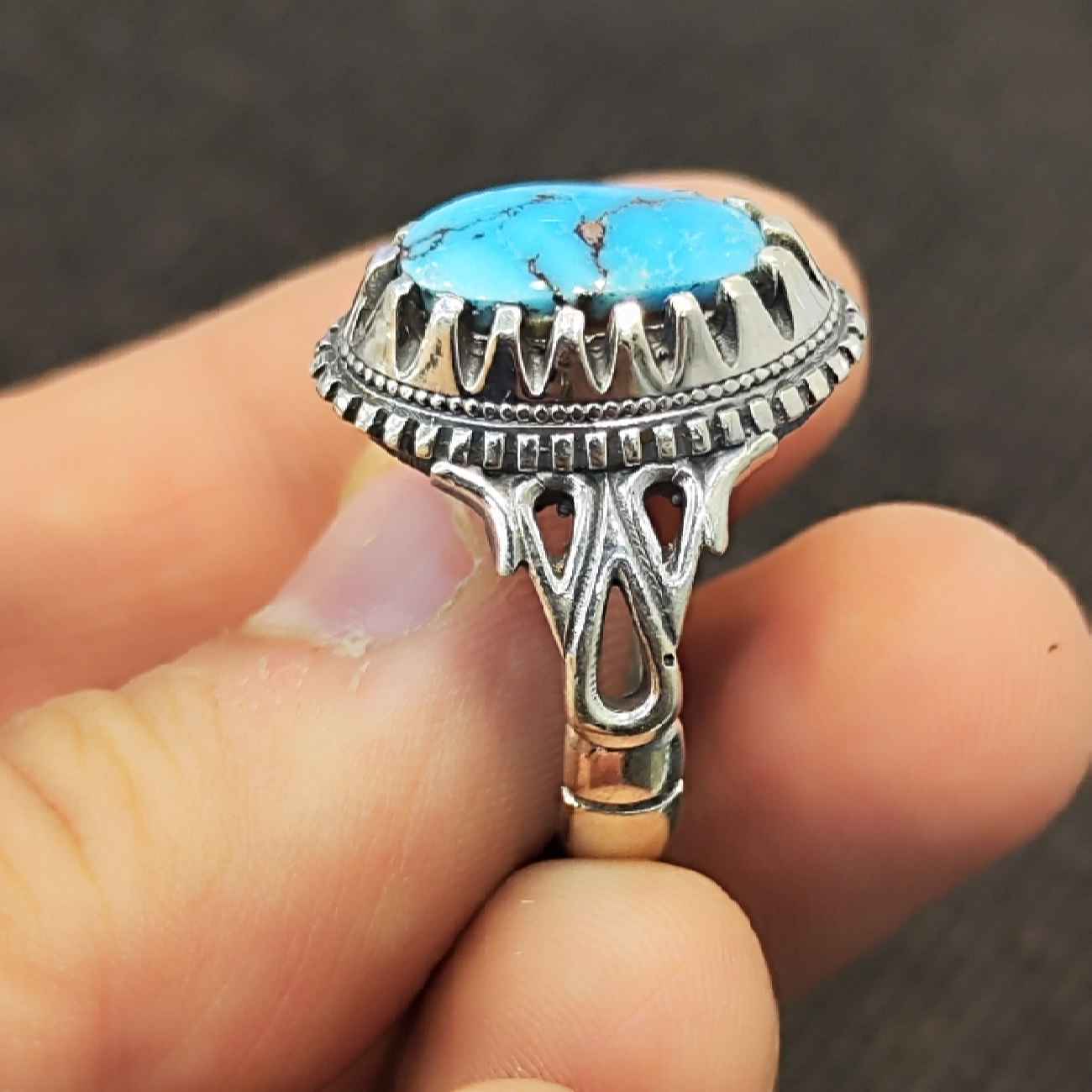 Weight 10.46 g Product Type Turquoise Ring Origin Iran Gemstone Type Natural Gemstone Neyshabur Turquoise Material Sterling Silver Design Traditional Persian Style Elegance Gender Male Age Group Adult Color Cyan Occasion Ceremony, Formal Events Size 12