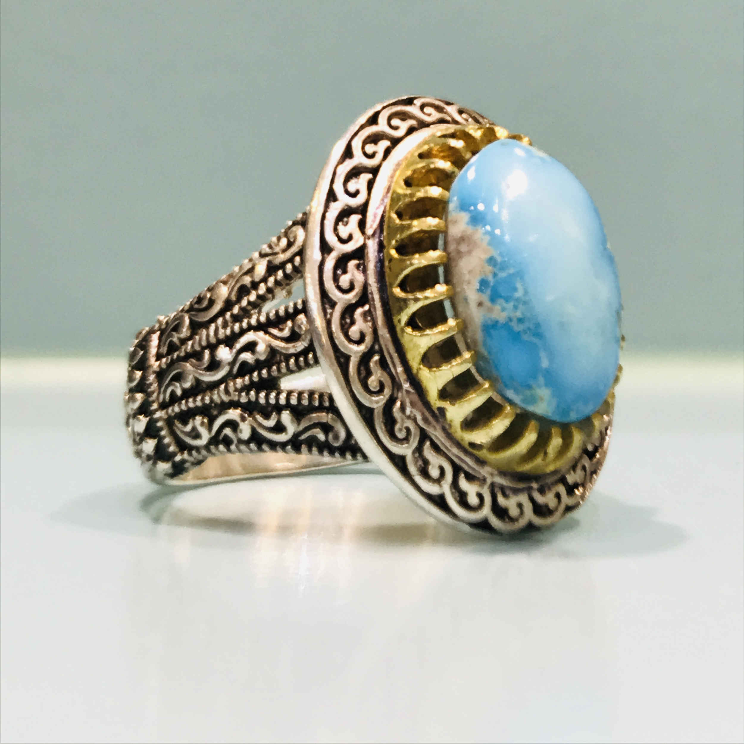 Weight 100 g Condition New Product Type Turquoise Ring Gemstone Type Natural Origin Iran Gemstone Neyshabur Turquoise Material Sterling Silver Design Traditional Persian Style Elegance Gender Male Age Group Adult Color Gold