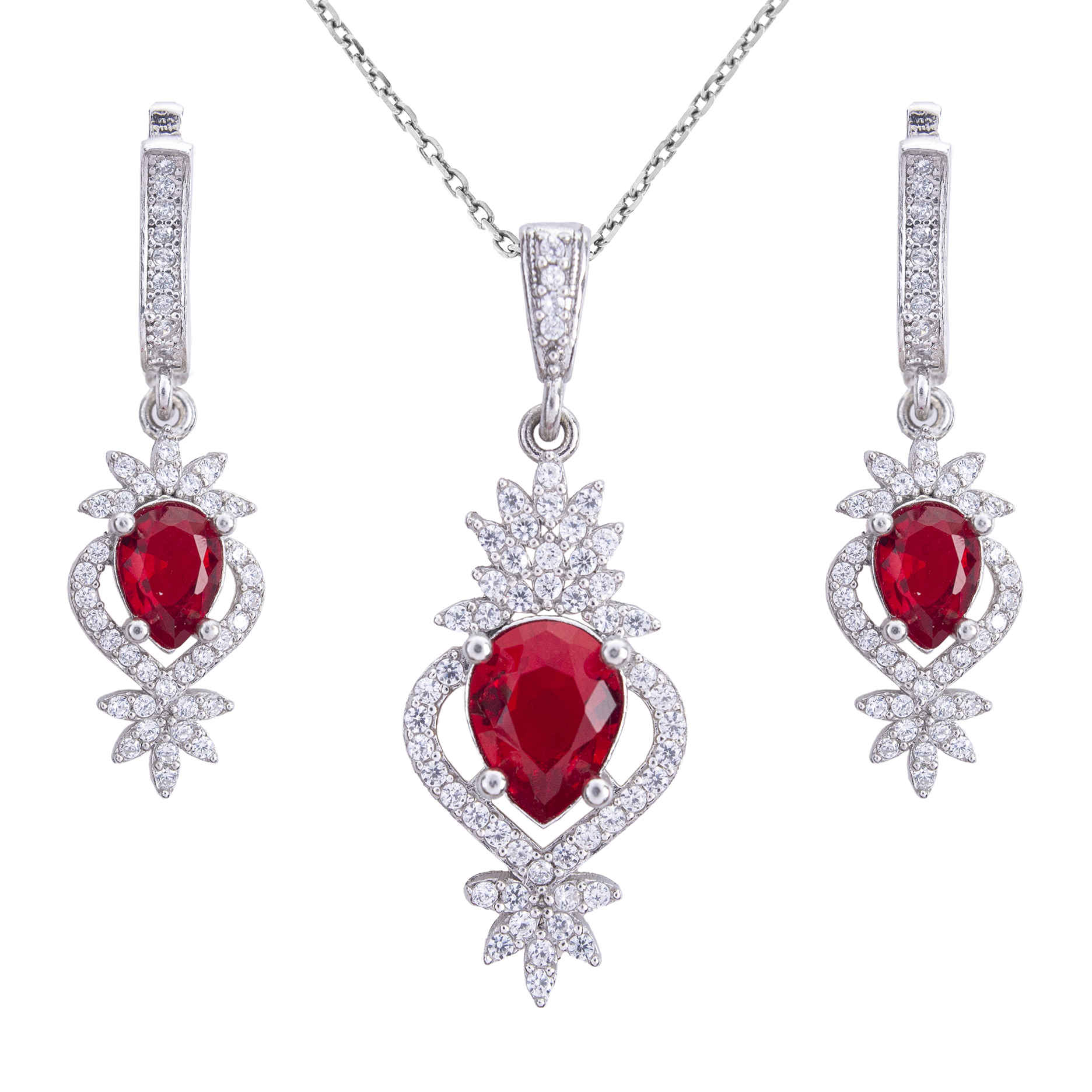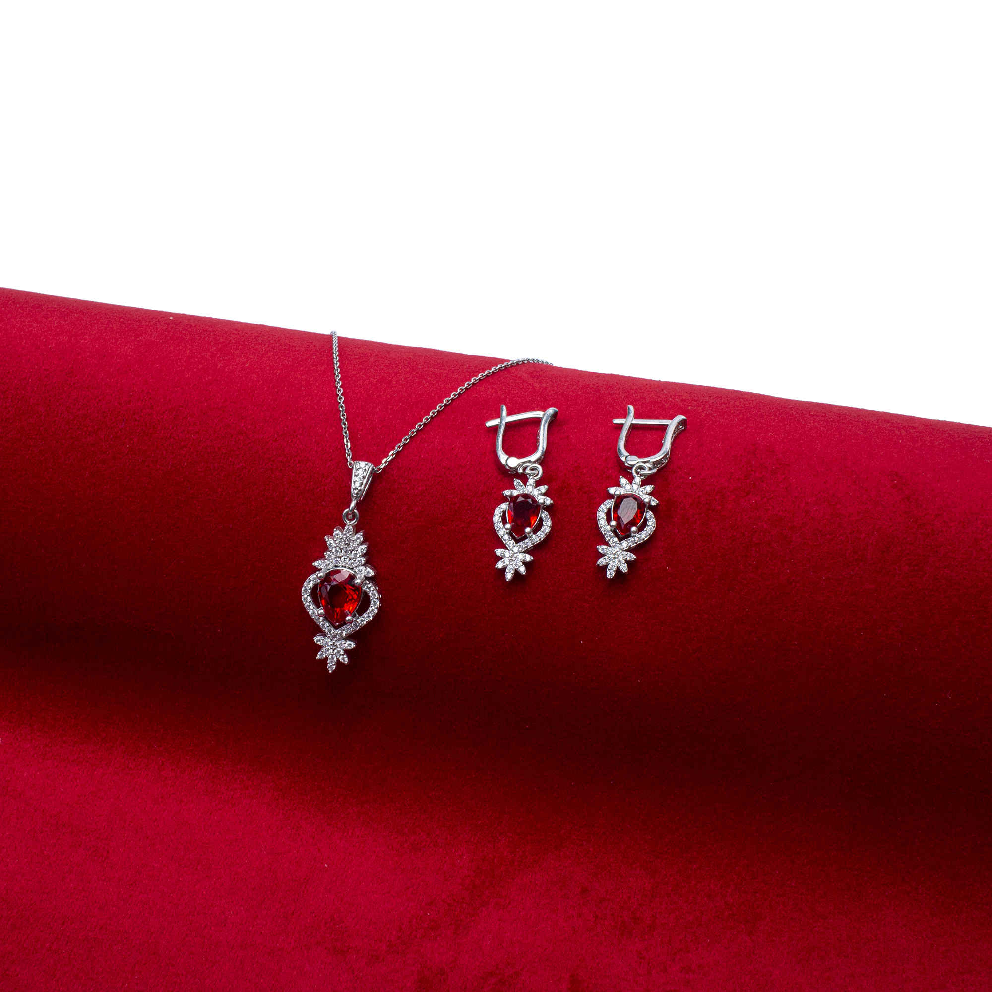The Silver Jewelry Set with Ruby Gemstone is a captivating collection that exudes elegance and sophistication. This exquisite set includes a matching necklace and pair of earrings, each featuring a stunning ruby gemstone set in beautifully crafted sterling silver. Designed to make a statement, the Silver Jewelry Set with Ruby Gemstone combines classic beauty with contemporary craftsmanship. The intricate silverwork highlights the natural beauty of the rubies, ensuring that each piece catches the light and draws attention. Whether given as a gift or worn to elevate your own style, this jewelry set offers a perfect blend of luxury and refinement, making it an essential addition to any jewelry collection.