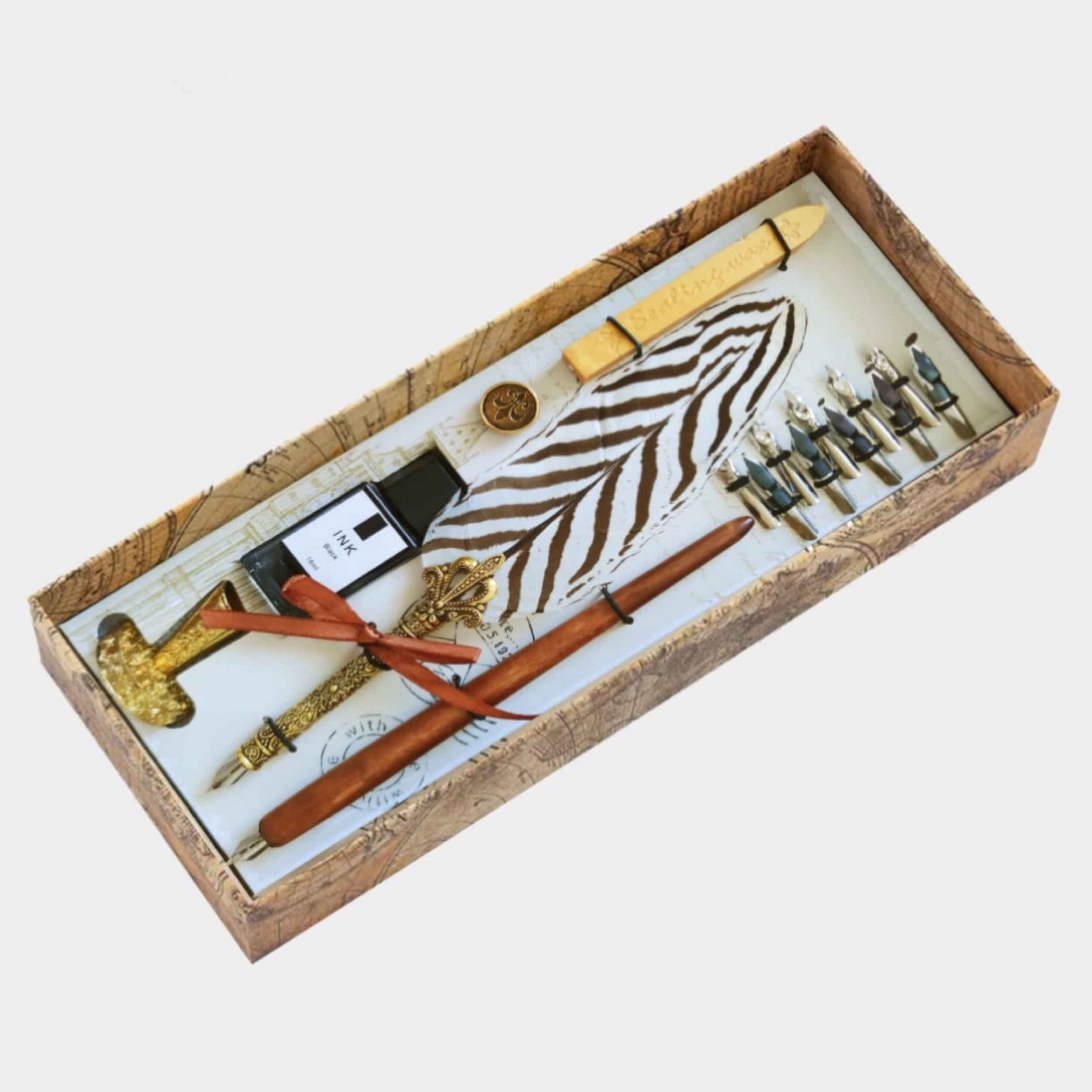 - Set Includes: Feather Pen, Metal Nib, Inkwell and Base