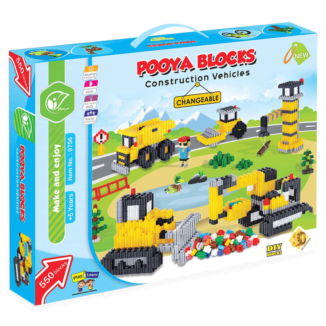 Discover endless creativity with the **Pooya Blocks: Construction Vehicles Toy Set**. This set stands out for its versatility and the wide range of pieces, allowing you to build realistic construction vehicles and more. With 550 pieces in various shapes and colors, perfectly matched to the included assembly instructions, the possibilities are endless. The images on the box show just a few examples of what can be built, but children can use their imagination to create countless other designs and structures. Crafted from high-quality PE and PP plastic, these blocks are designed for durability and vibrant, long-lasting colors. The set encourages kids to explore their creativity and problem-solving skills as they construct and customize their own vehicles. The diverse range of pieces ensures that every building project is a rewarding and engaging experience. Ideal for children ages 5 and up, this toy set is perfect for both solo play and group activities.