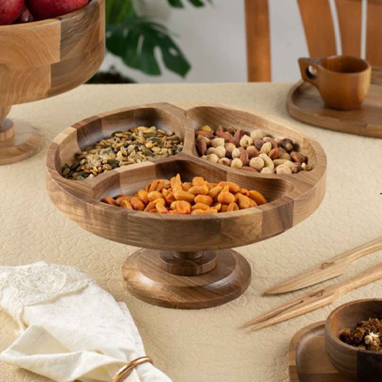Elevate your entertaining with this beautifully crafted Rustic Wooden Pedestal Serving Bowl. Made from high-quality, natural wood, this round platter combines style and functionality with its unique tri-sectional design. Perfect for serving a variety of snacks, fruits, dips, or appetizers, the divided compartments keep each food item neatly separated, making it ideal for gatherings and parties. The sturdy pedestal base adds height and a touch of elegance, making it a stunning centerpiece on any table. Its warm, natural wood grain patterns bring a rustic charm that complements both modern and traditional decor styles. Durable, easy to clean, and designed to impress, this serving bowl is a must-have for any host or hostess looking to add a touch of sophistication to their entertaining essentials.