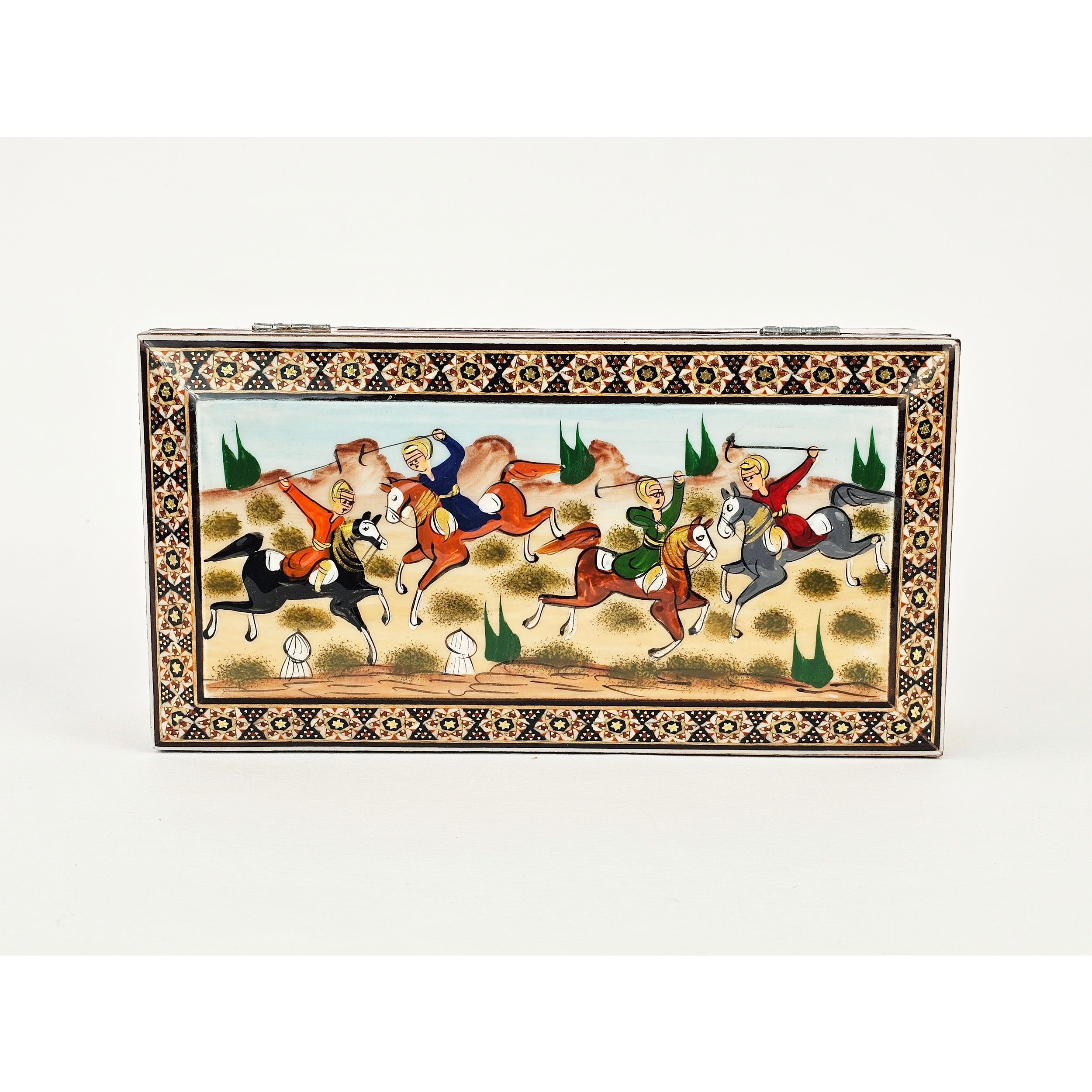 The Wooden Business Card Box Handcrafted Persian Khatamkari in Chogan Design is a blend of functionality and artistry. This luxurious box is meticulously crafted using the ancient Persian Khatamkari technique, renowned for its intricate inlay work. The Chogan design, inspired by traditional Persian polo, adds historical elegance and sophistication. It provides a stylish and secure way to store and display business cards, making a striking impression in any professional setting. The smooth finish and robust construction ensure durability and long-lasting beauty. Ideal for executives, entrepreneurs, and art enthusiasts, this handcrafted business card box is both a practical accessory and a statement of refined taste and cultural appreciation. Elevate desk decor and keep business cards organized in a way that reflects unique style and heritage. This box is perfect as a gift, celebrating craftsmanship and timeless elegance.