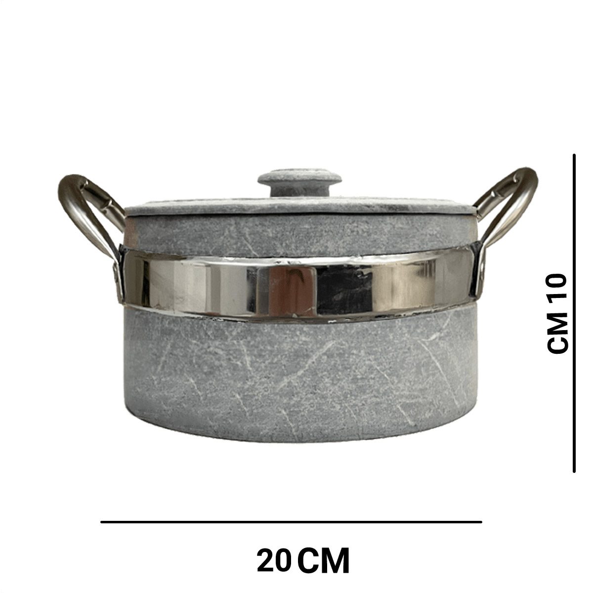 The Royal Stone Cooking Pot, also known as the Dizi Stone Pot or Stone Casserole, is crafted from a single piece of soapstone and includes a steel handle for durability and safety.
