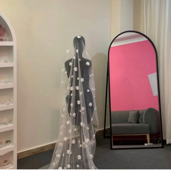 Price and Buy Soft Tulle Wedding Veil with Floral Lace Appliqué and Cathedral Train – Graceful and Elegant