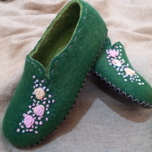 Price and Buy Emerald Green Wool Felt Slippers with Handcrafted Floral Embroidery